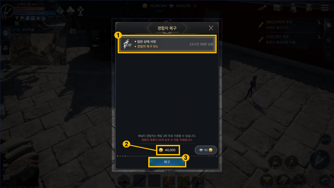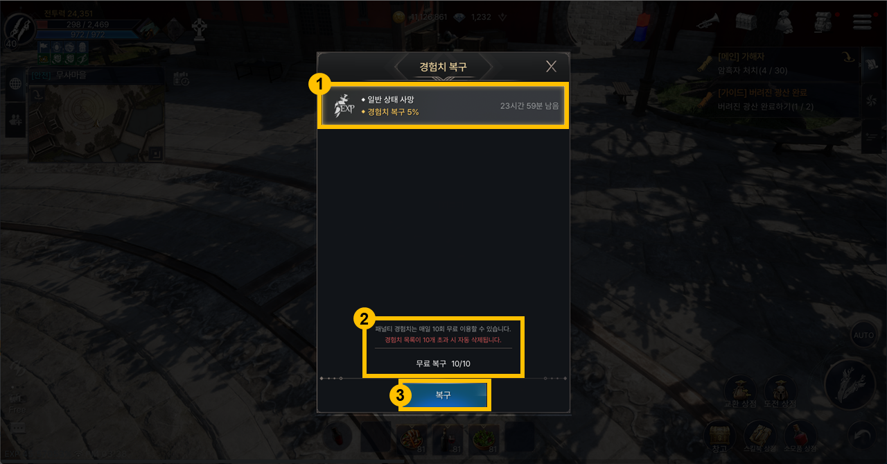 - 복구할 수 있는 경험치와 남은 시간을 확인할 수 있습니다.