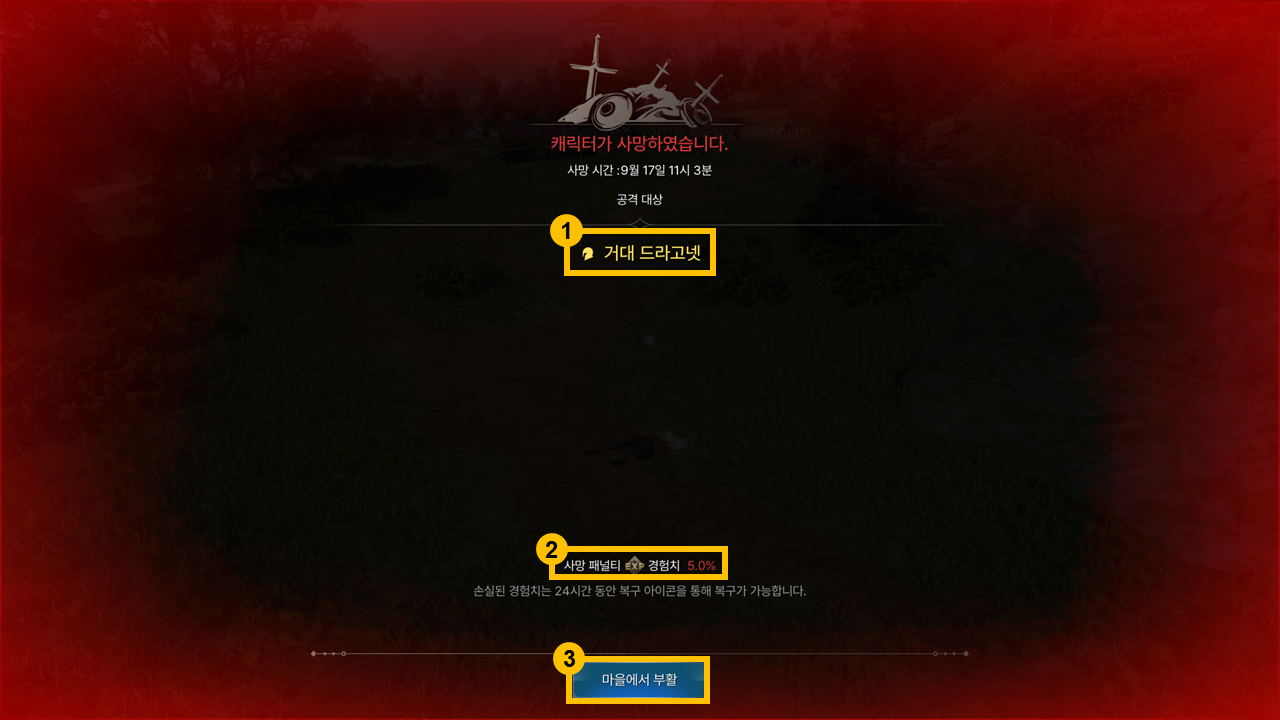 - 사망 패널티로 인한 경험치 손실을 확인할 수 있습니다.