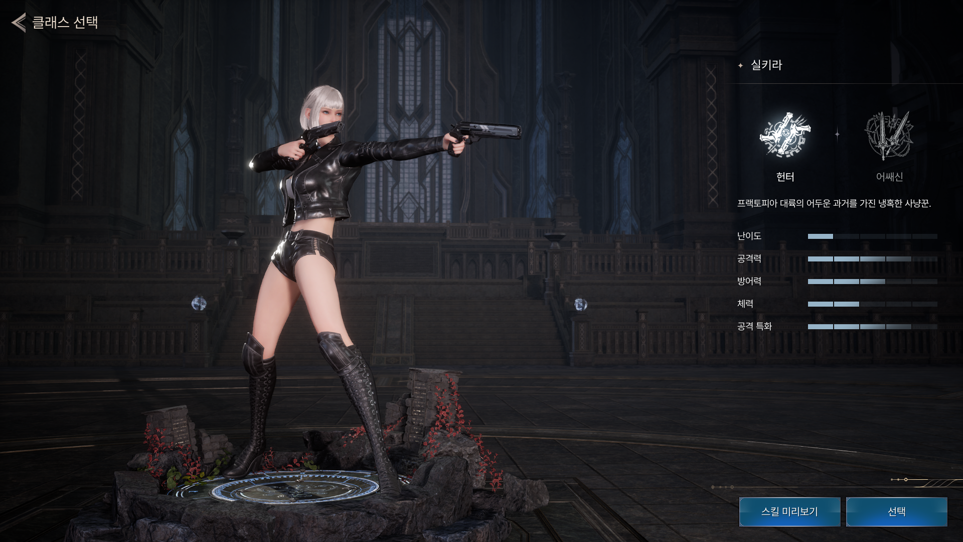 - 실키라는 어린 시절에 가족을 잃은 헌터입니다. 총을 사용하며 원거리 교전에 능한 헌터, 쌍차를 사용하며 기습으로 적에게 일격을 가하는 어쌔신, 두 가지 클래스로 플레이할 수 있습니다.