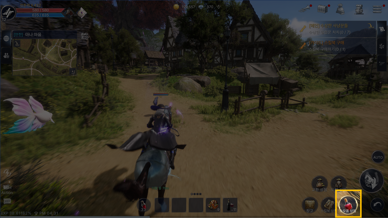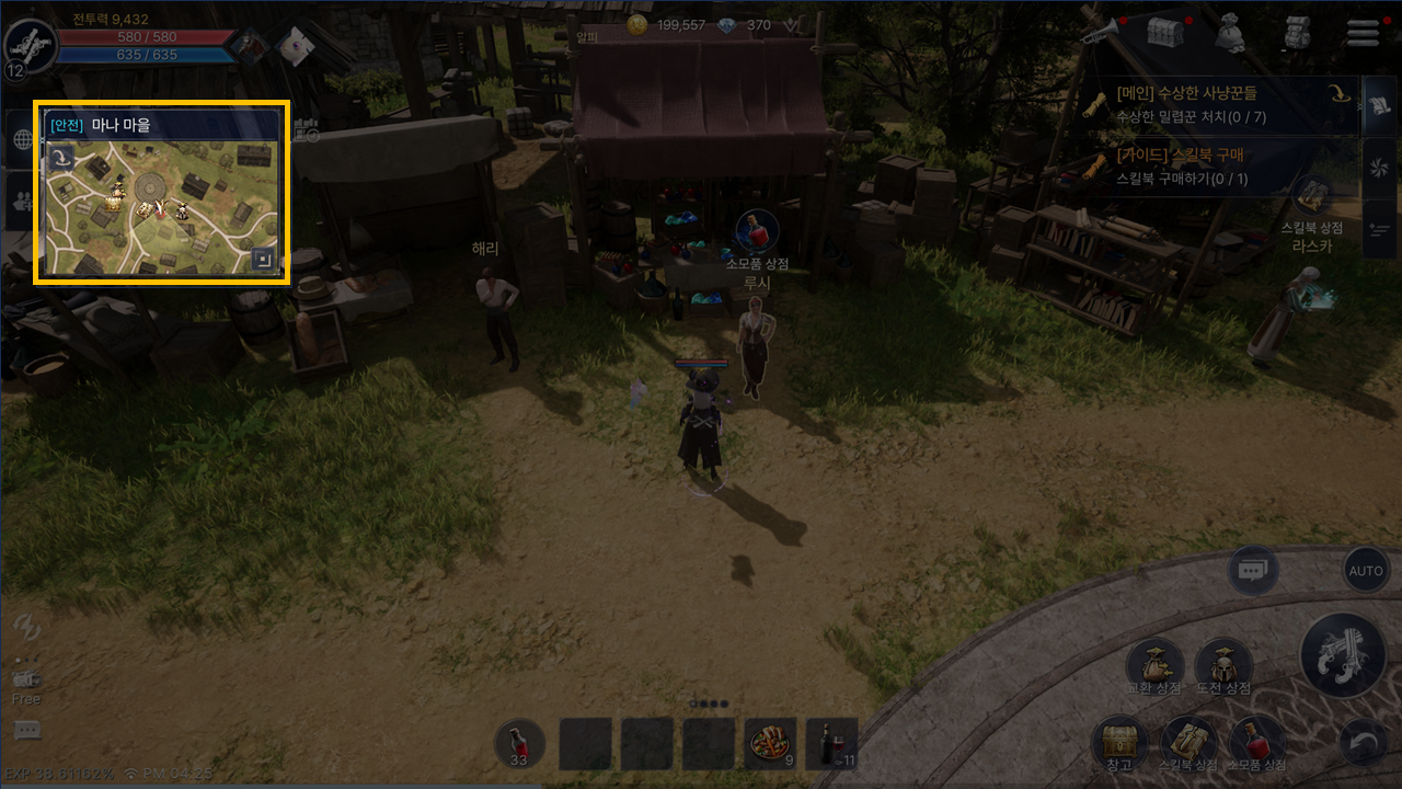 - - 마을에서는 소모품 상점, 스킬북 상점, 교환 상점, 도전 상점을 이용할 수 있습니다.