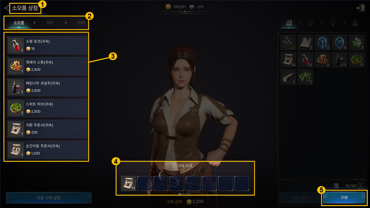- 가방에 보유한 수량과 합산되어 설정한 수량까지 자동으로 구매됩니다.