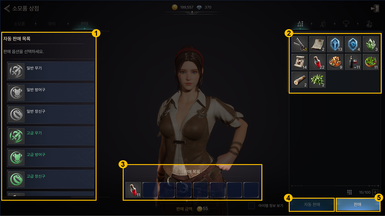 - - 인벤토리에서 선택한 아이템을 담아 여러 개의 아이템을 한 번에 판매할 수 있습니다.