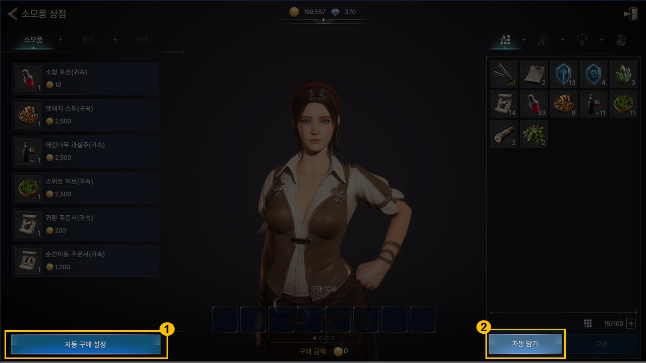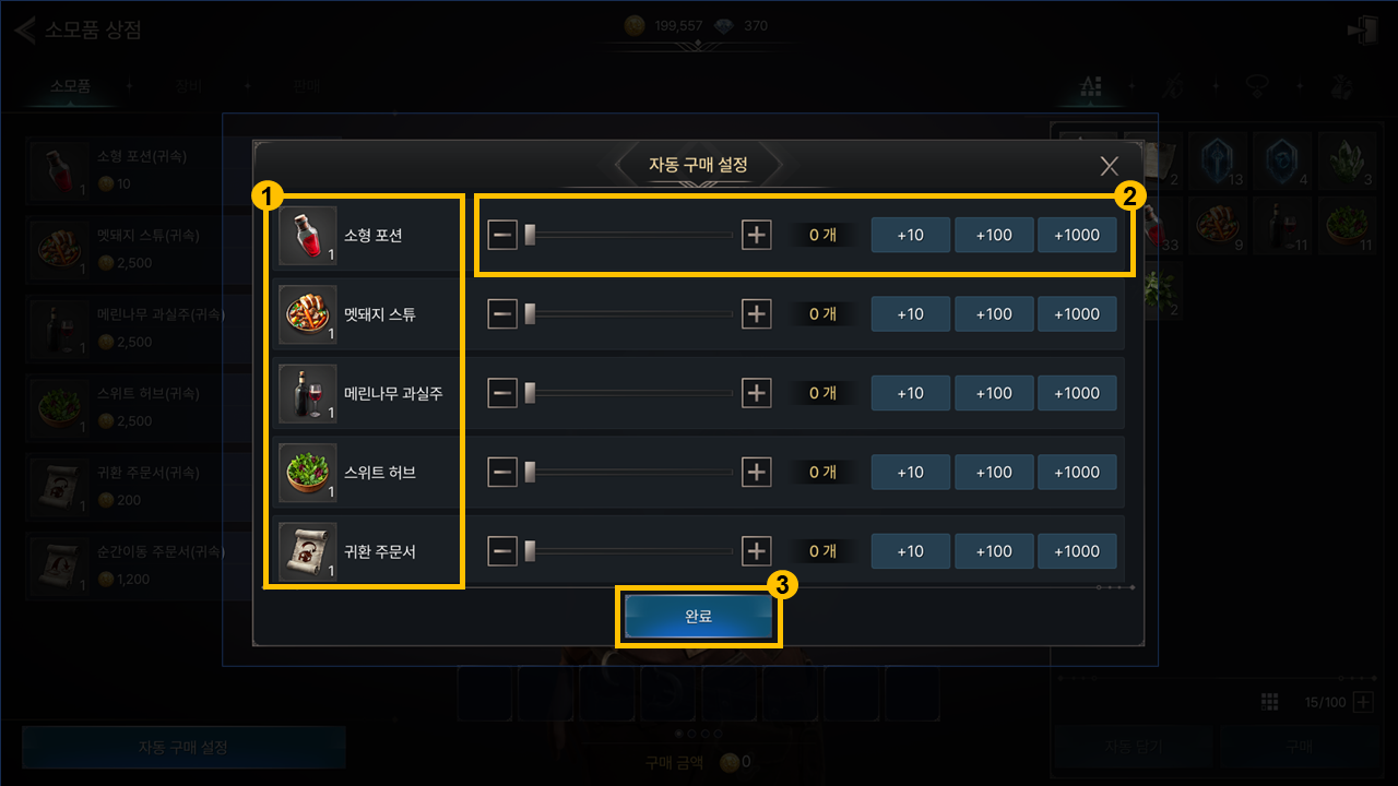 - 소모품 구매 시 자동 구매할 아이템의 종류와 개수를 설정할 수 있습니다.