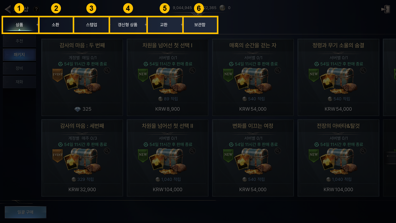 - - 추천 상품, 패키지 상품, 장비, 재화를 구매할 수 있습니다.