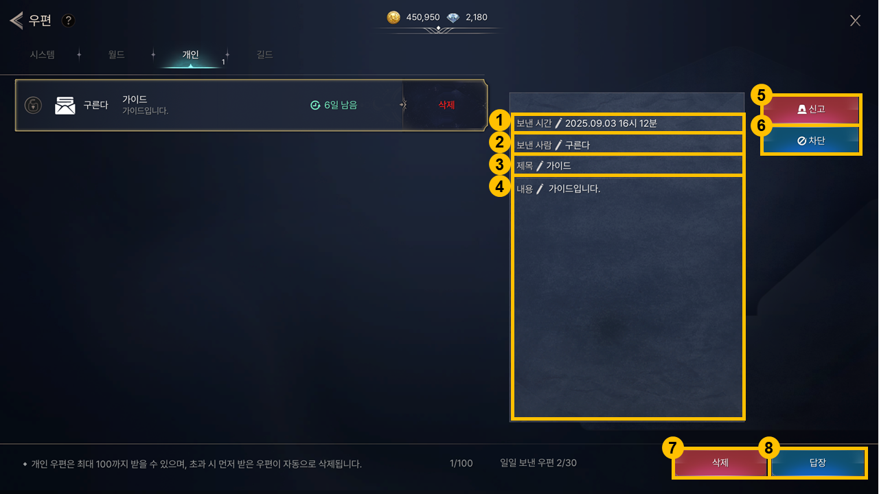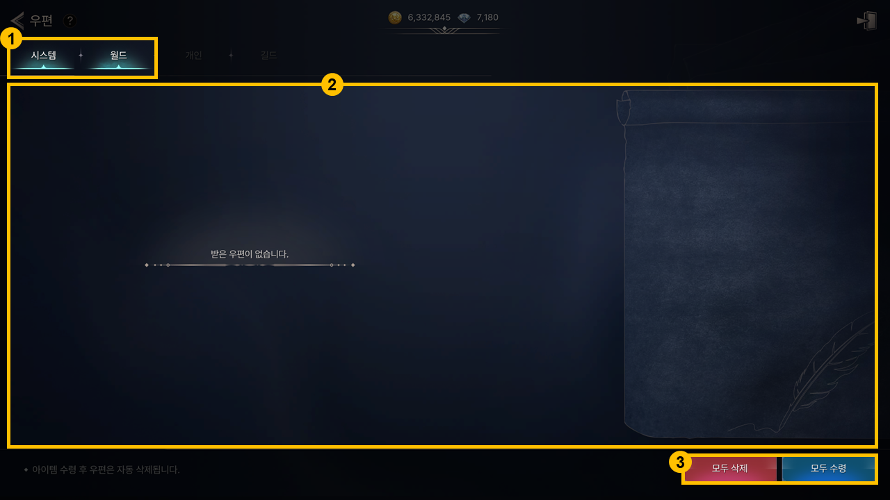 ※ 개인 및 길드 우편은 최대 100개까지 받을 수 있으며, 초과 시 먼저 받은 우편이 자동으로 삭제됩니다.