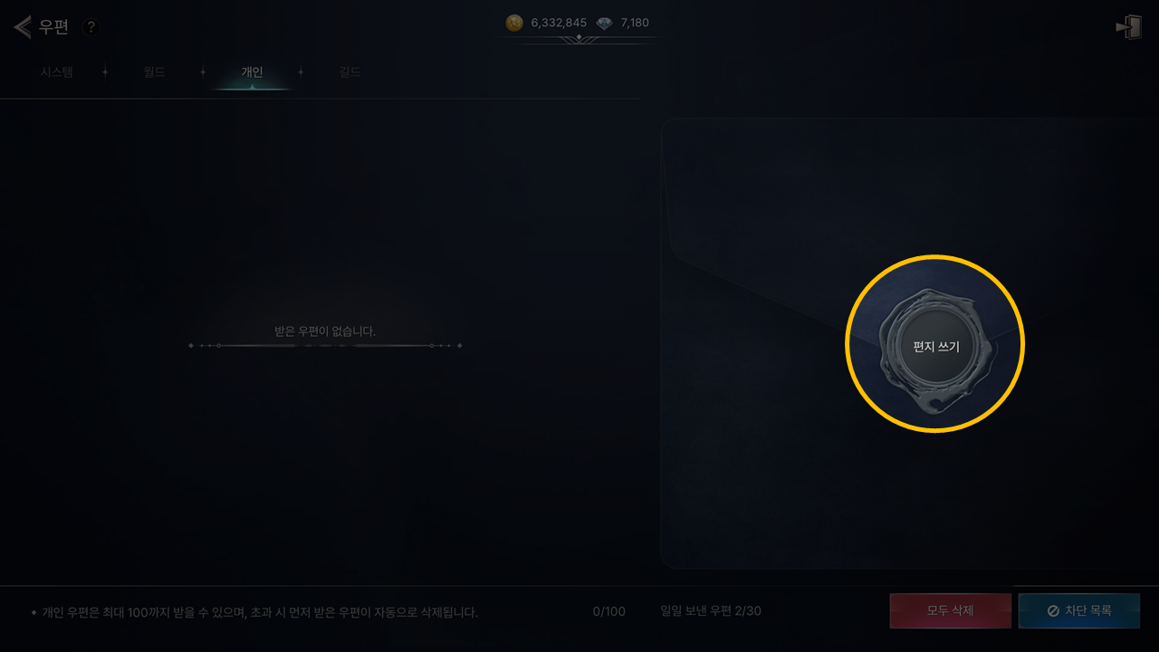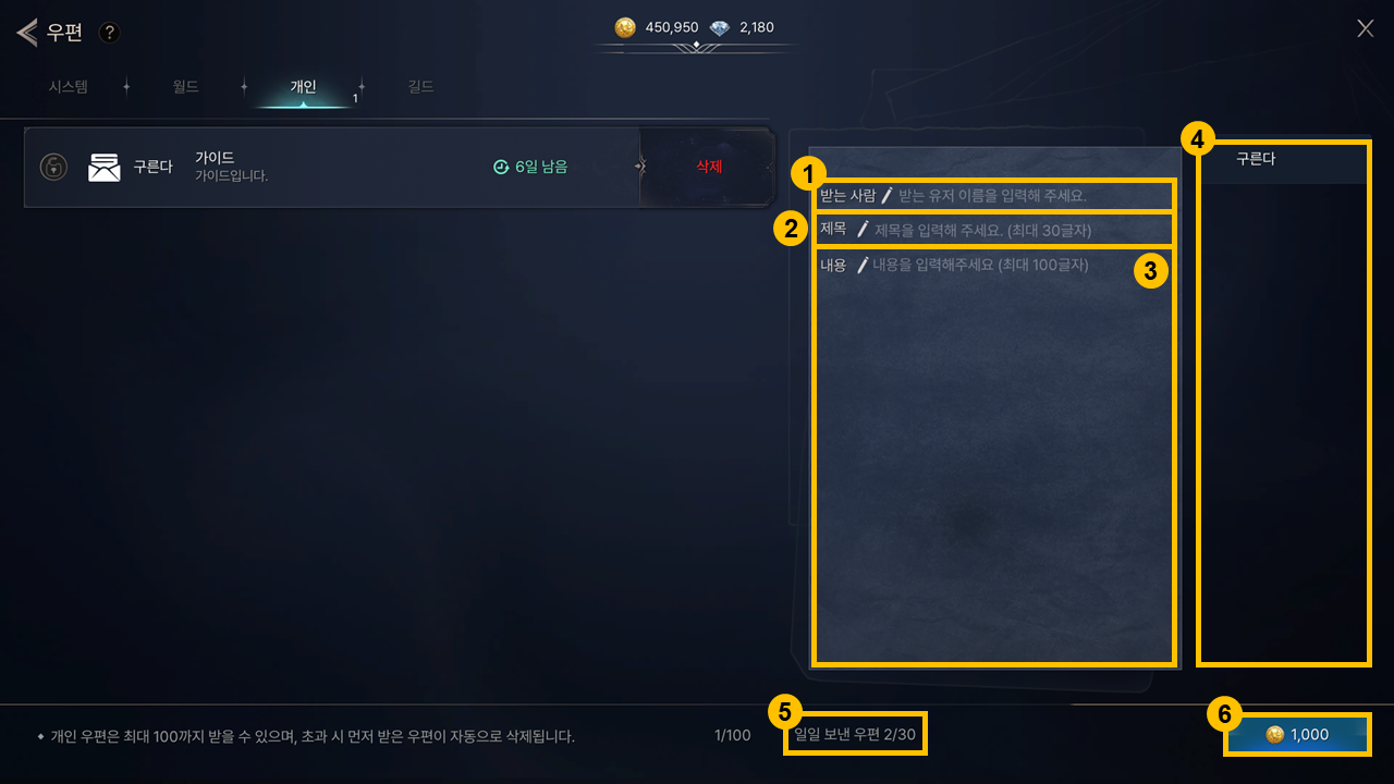 우편함에서는 수신된 우편을 확인하고, 개인/길드 우편을 발송할 수 있습니다.