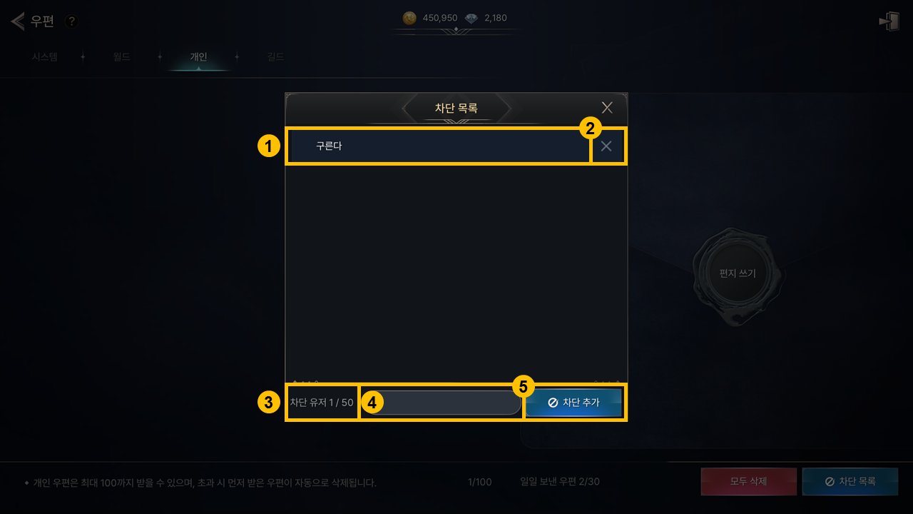 - - 클릭 시 해당 우편을 보낸 유저를 우편 차단 목록에 추가합니다.
