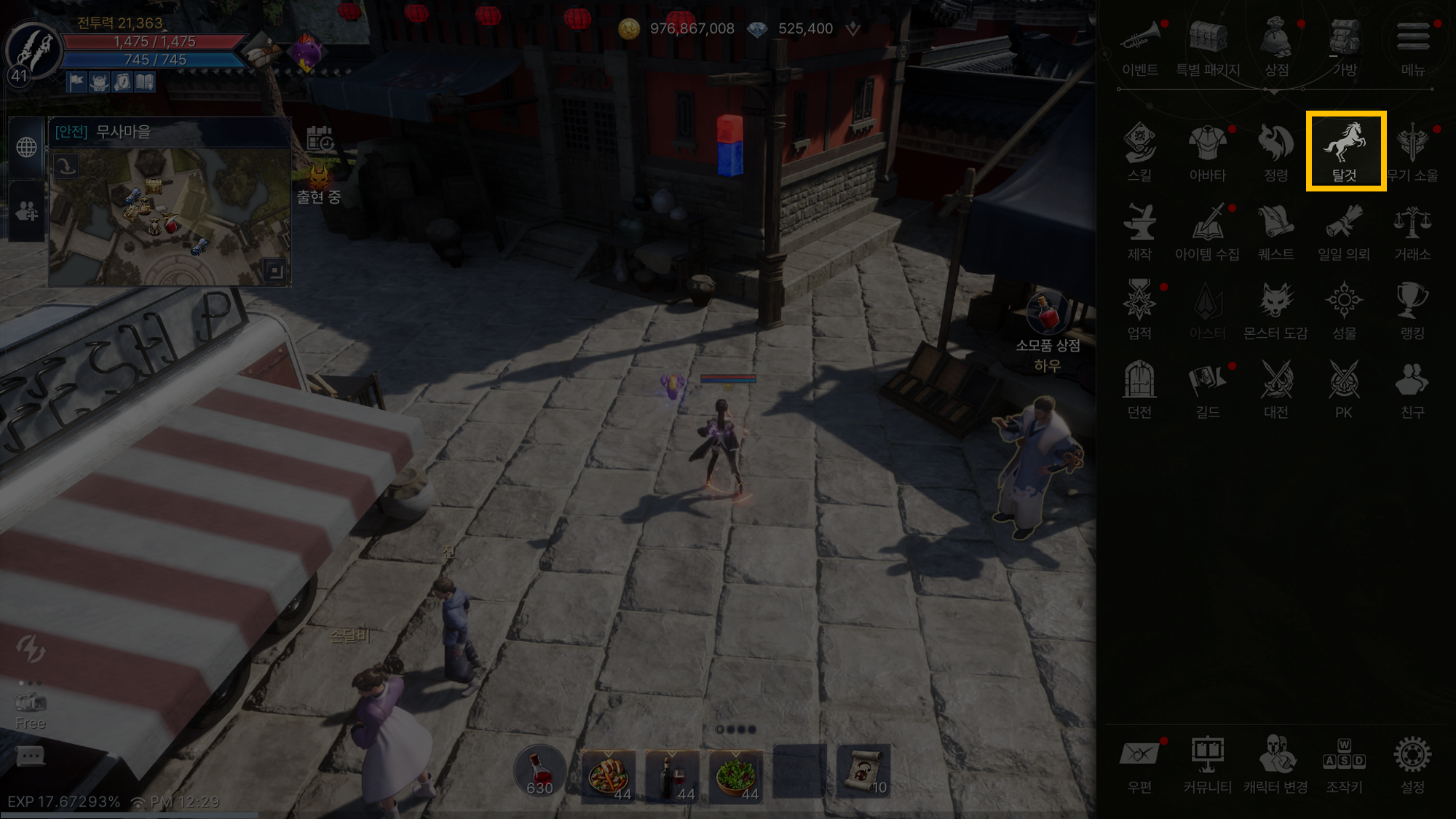 - 화면 우측 상단 [메뉴] – [탈것]을 눌러서 탈것 메뉴로 진입할 수 있습니다.