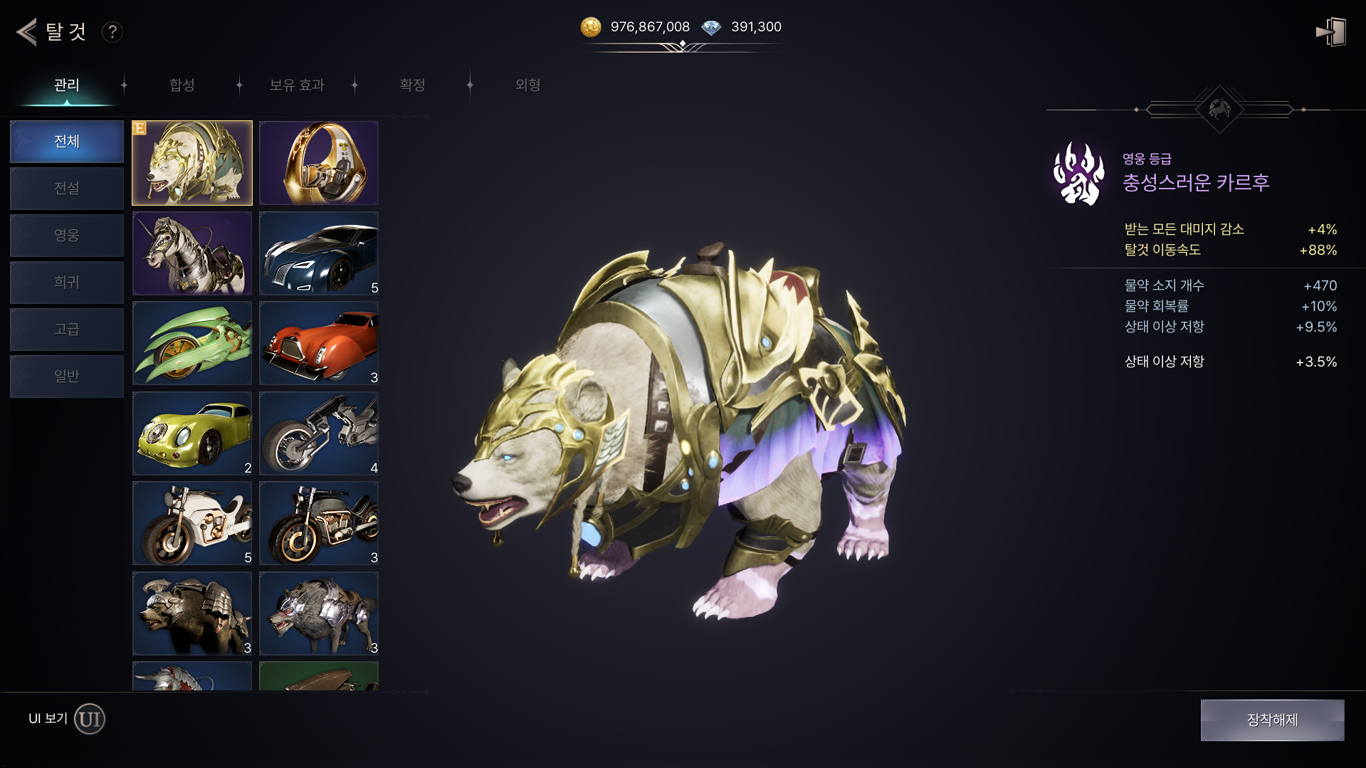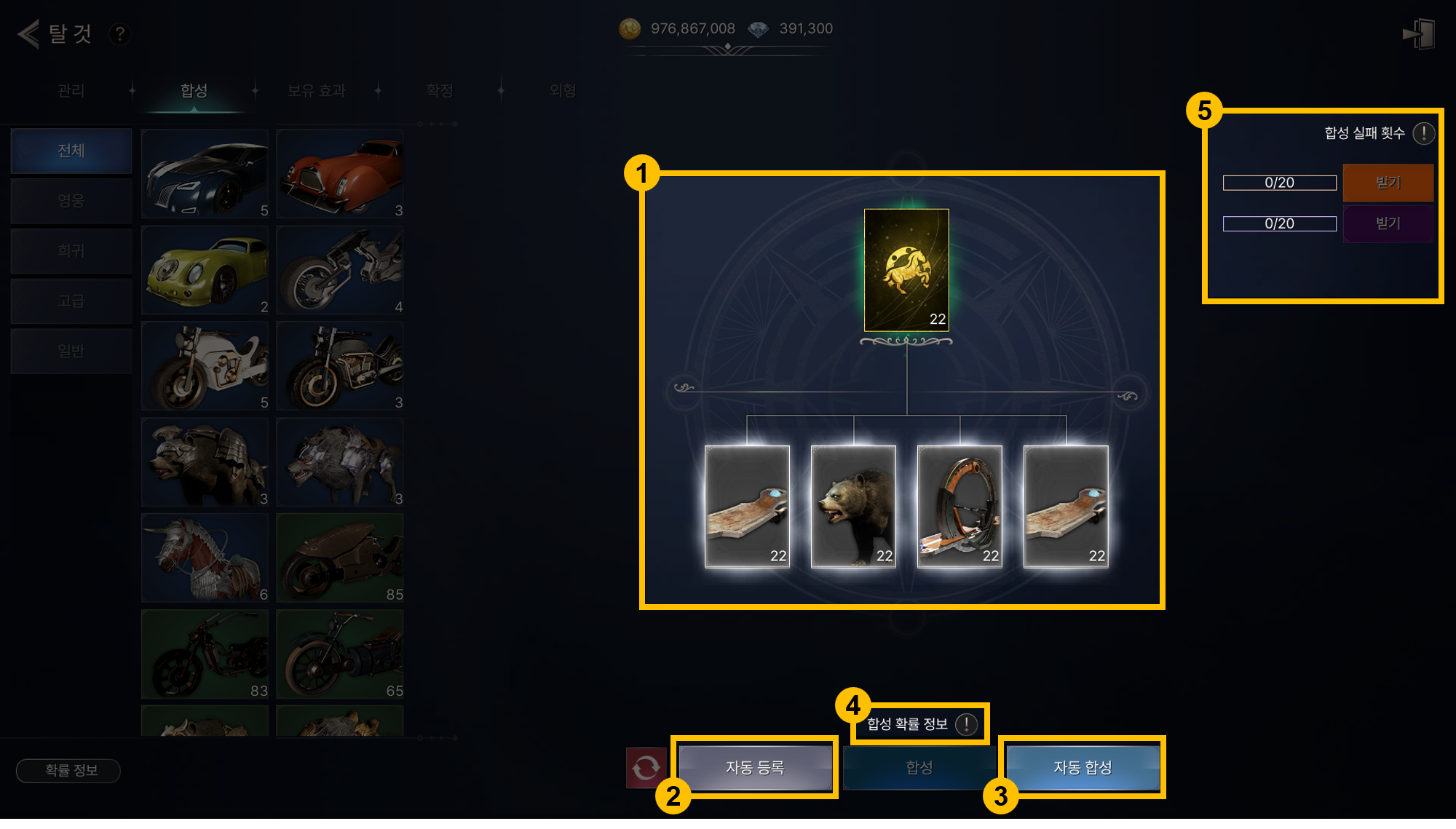 - 동일 등급의 탈것을 사용하여 합성할 수 있으며, 일정 확률로 상위 등급의 탈것을 획득할 수 있습니다.