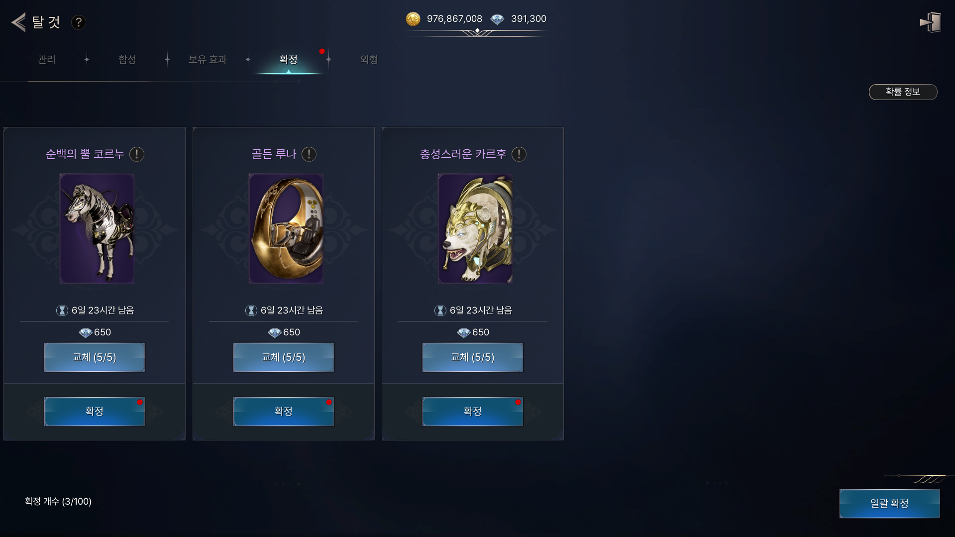 - 확정 전인 탈 것은 다이아몬드를 사용하여 동일한 등급의 다른 탈것으로 최대 5회 교체할 수 있습니다.
