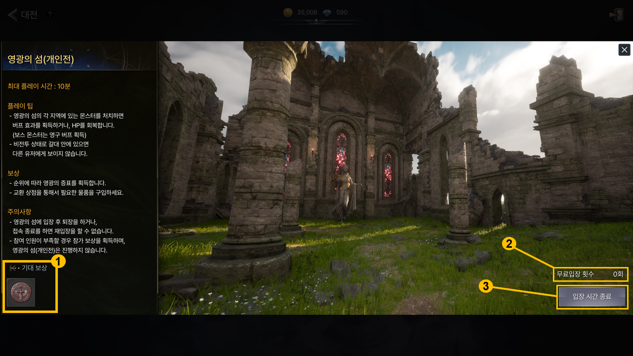 ※ 입장 가능 시간이 아닐 경우 영광의 섬(개인전)에 입장할 수 없습니다.