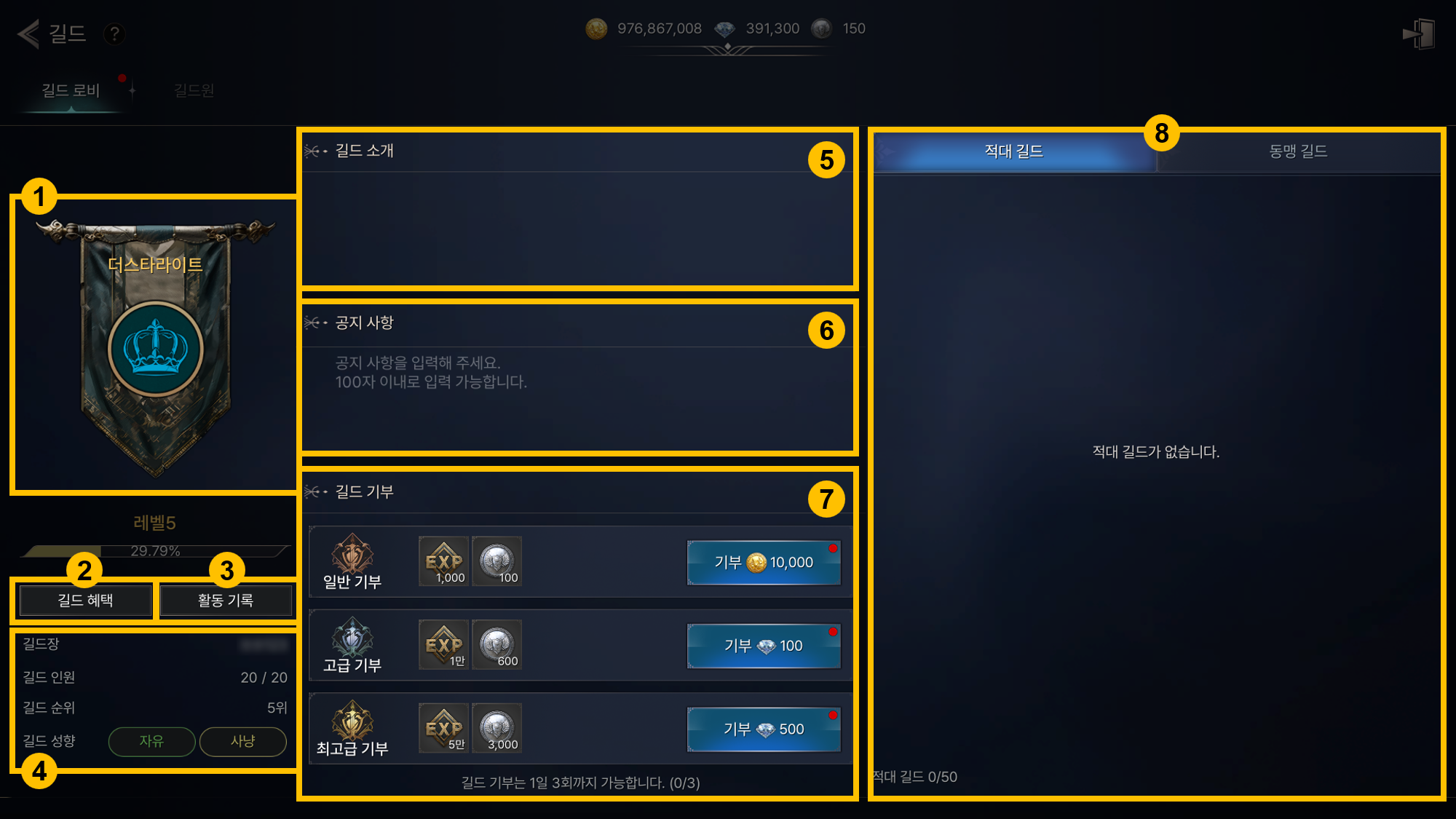 - ⑧ 적대 길드/동맹 길드/요청 현황