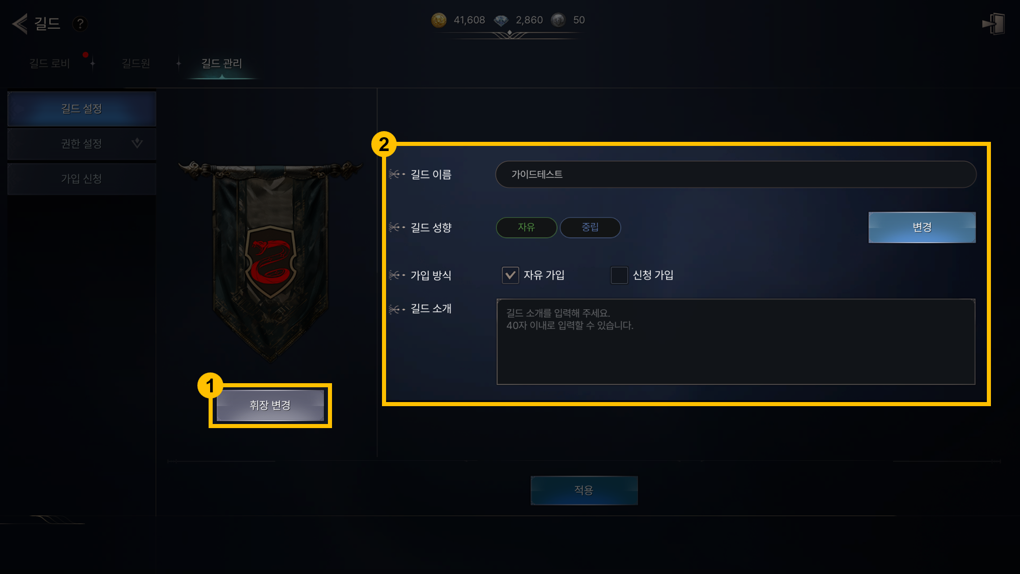 - - 길드 이름, 성향, 가입 방식, 길드 소개를 변경할 수 있습니다.