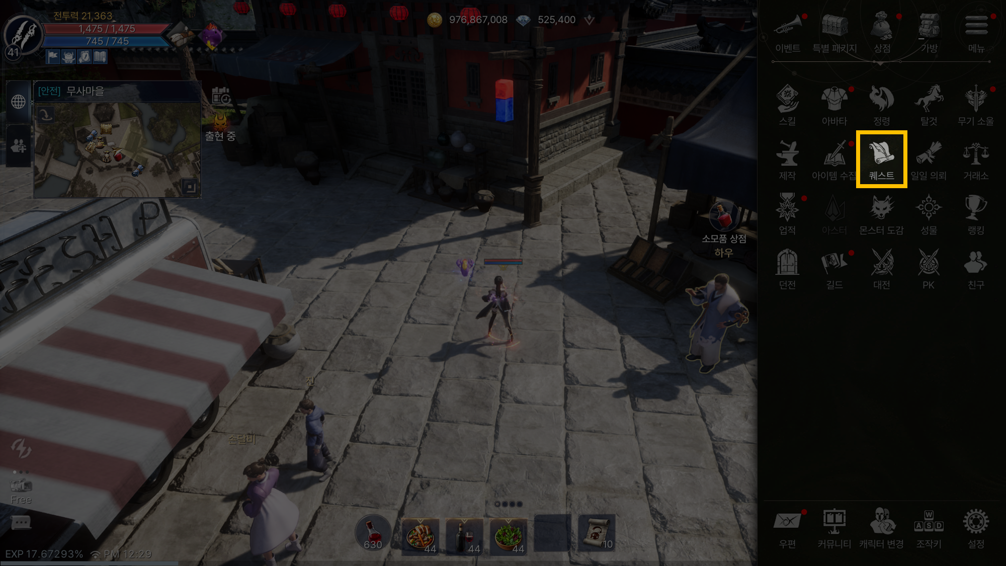 - [메뉴] – [퀘스트]를 눌러서 퀘스트 메뉴로 진입할 수 있습니다.