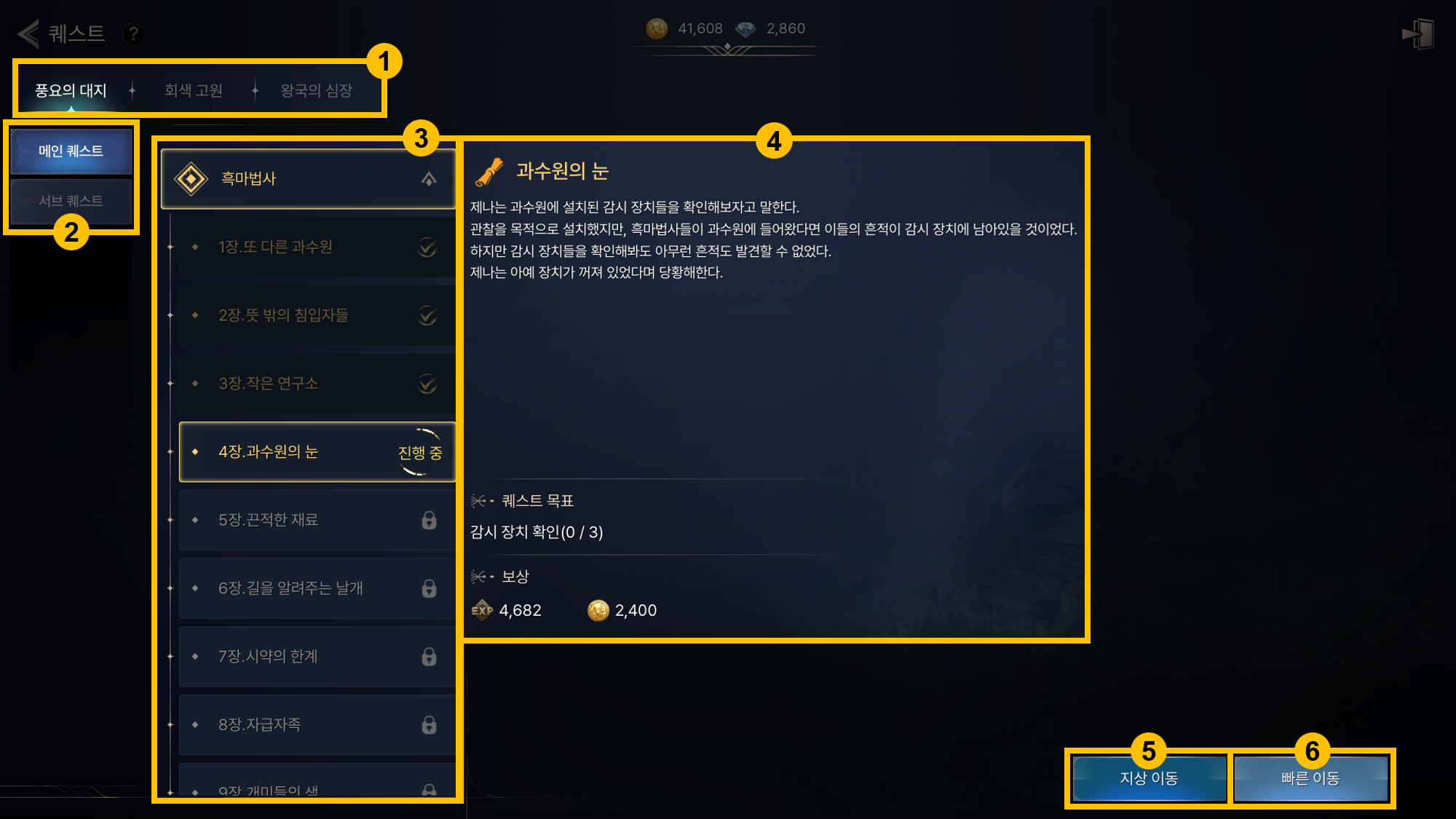 - 메인 퀘스트는 퀘스트 메뉴에 노란색으로 표시되며, 메인 퀘스트의 진행도에 따라 서브 퀘스트를 진행할 수 있습니다.