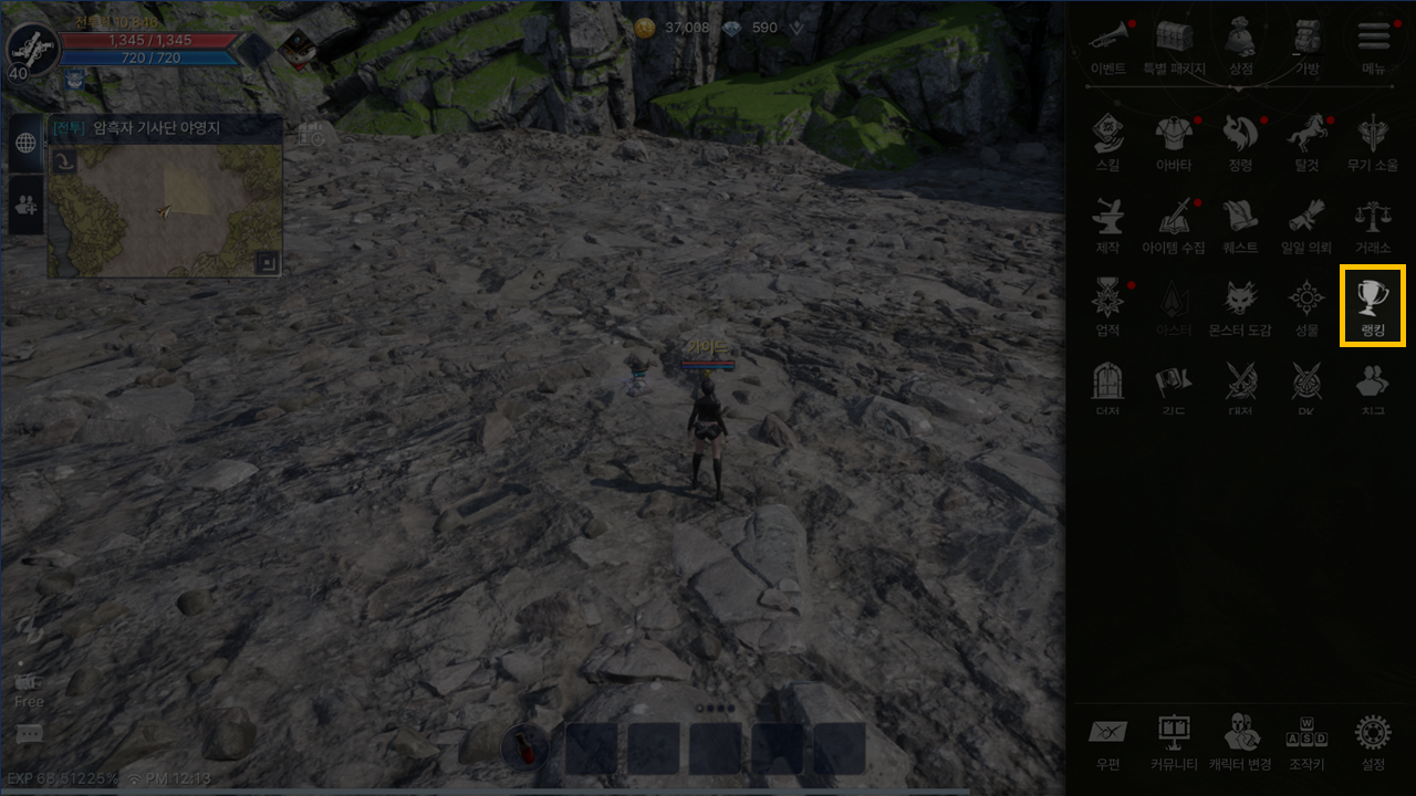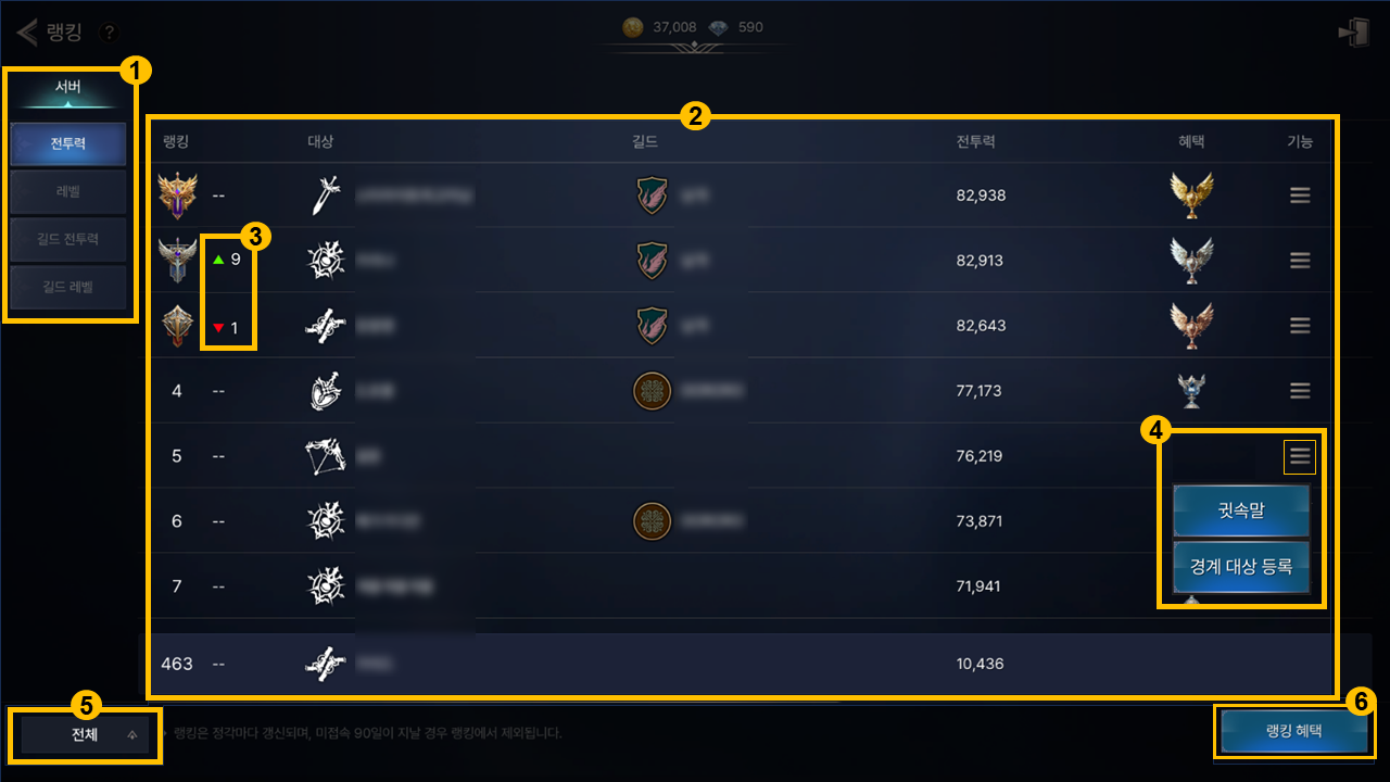 랭킹에서는 캐릭터와 길드의 전투력/레벨 기준 순위를 확인할 수 있습니다.