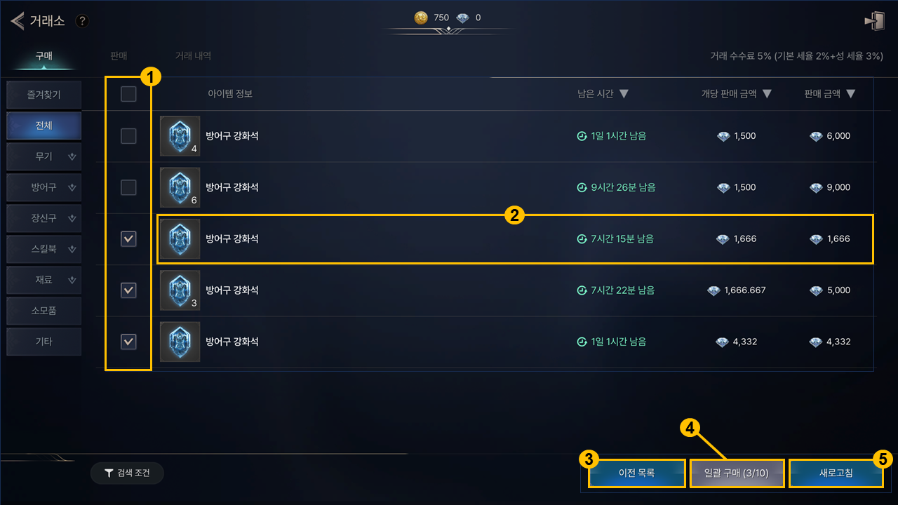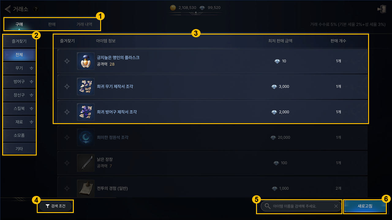 - 구매 탭 하단의 각 아이템 목록에서 다른 플레이어가 등록한 아이템을 확인하고, 구매할 수 있습니다.