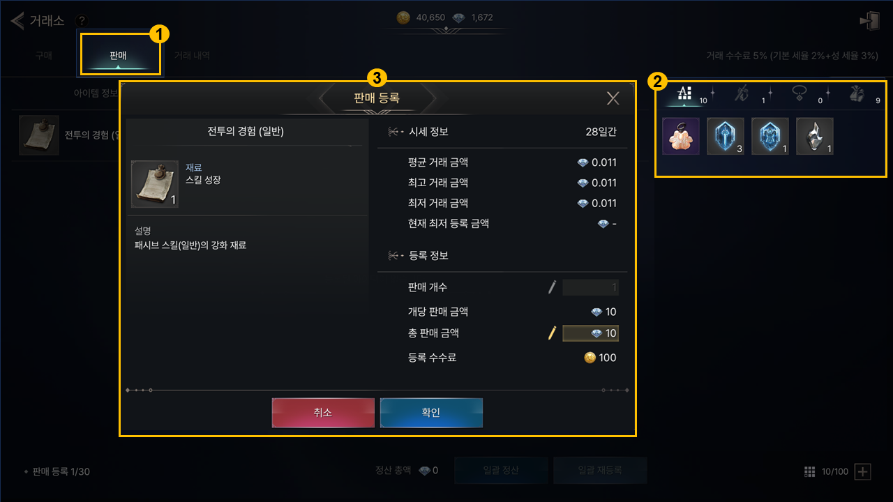 - - 판매 등록 시 등록 수수료로 골드를 소모합니다.