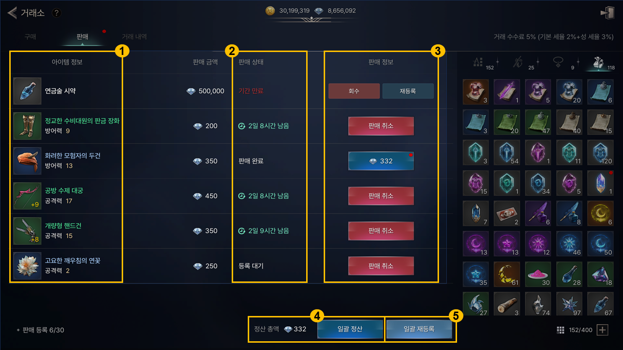 - - 기간 만료 상태의 물품은 ‘재등록’을 눌러 다시 거래소에 물품을 등록하거나, ‘회수’를 눌러 가방으로 아이템을 회수할 수 있습니다.