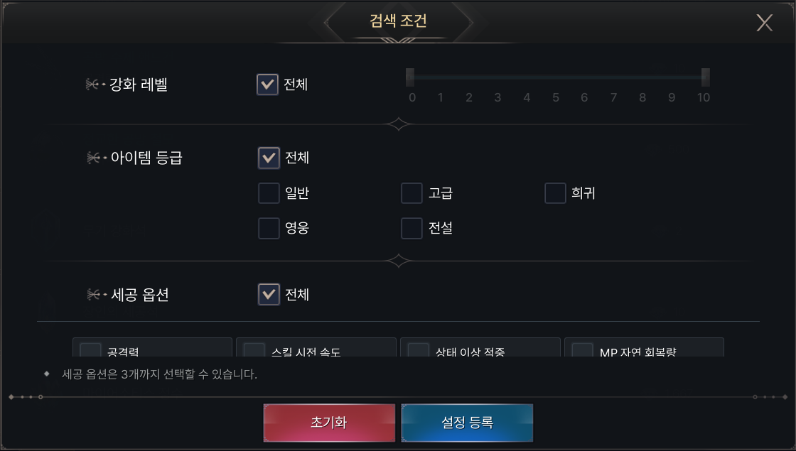 - - 강화 레벨, 아이템 등급, 세공 옵션 등을 상세히 설정하여 검색할 수 있습니다.