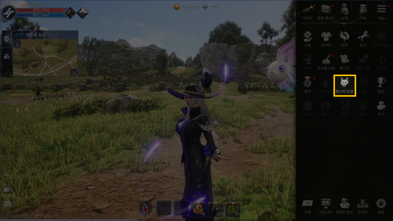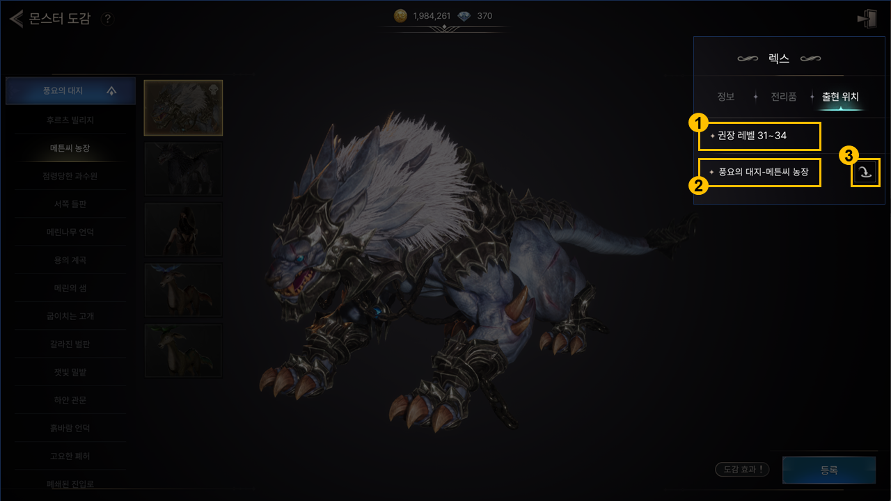 ※ 몬스터 도감은 풍요의 대지 메인 퀘스트 [메튼씨의 농장 10장.몬스터의 기록]을 완료하면 이용할 수 있습니다.