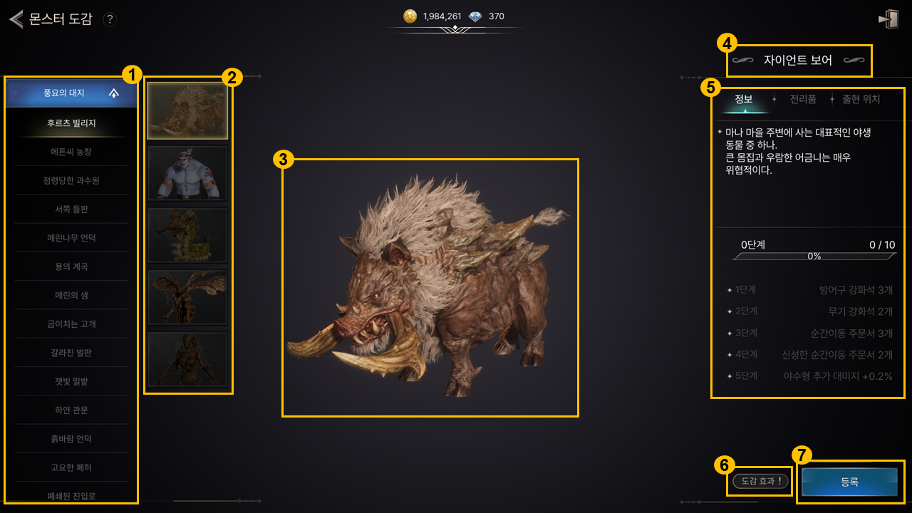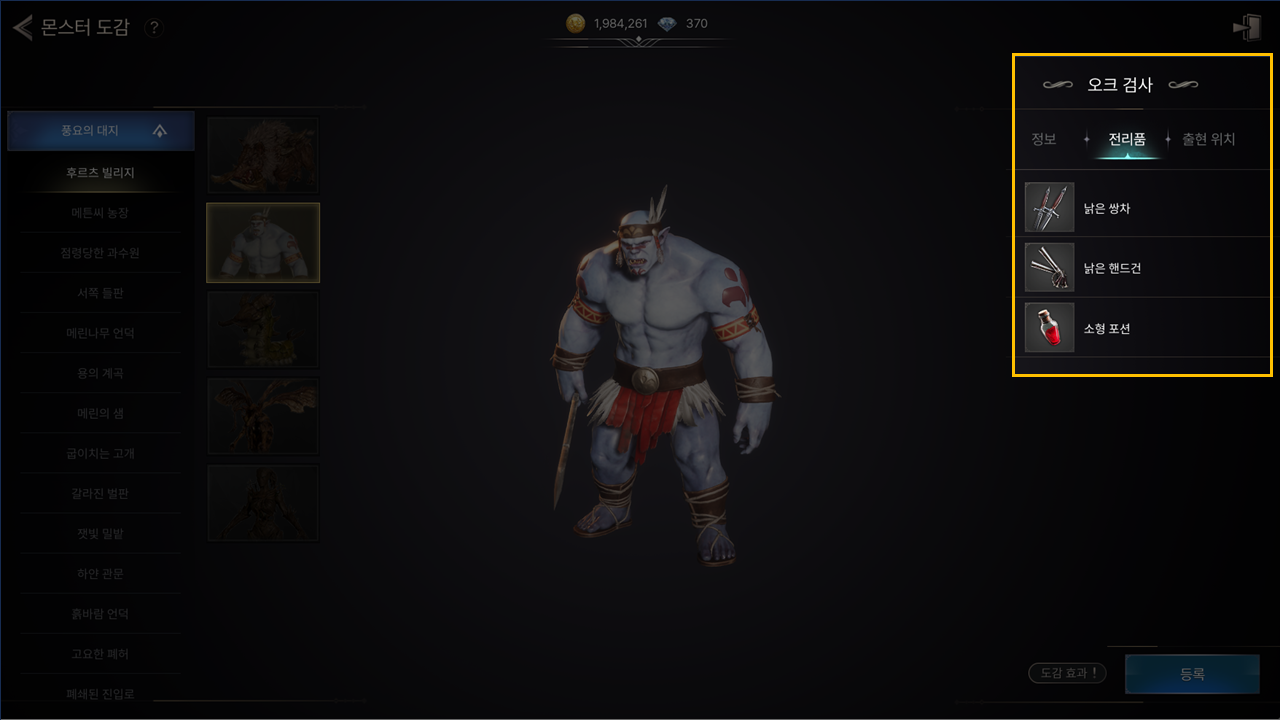- - 몬스터의 설명 및 등록 단계별 보상/전리품/출현 위치를 확인할 수 있습니다.