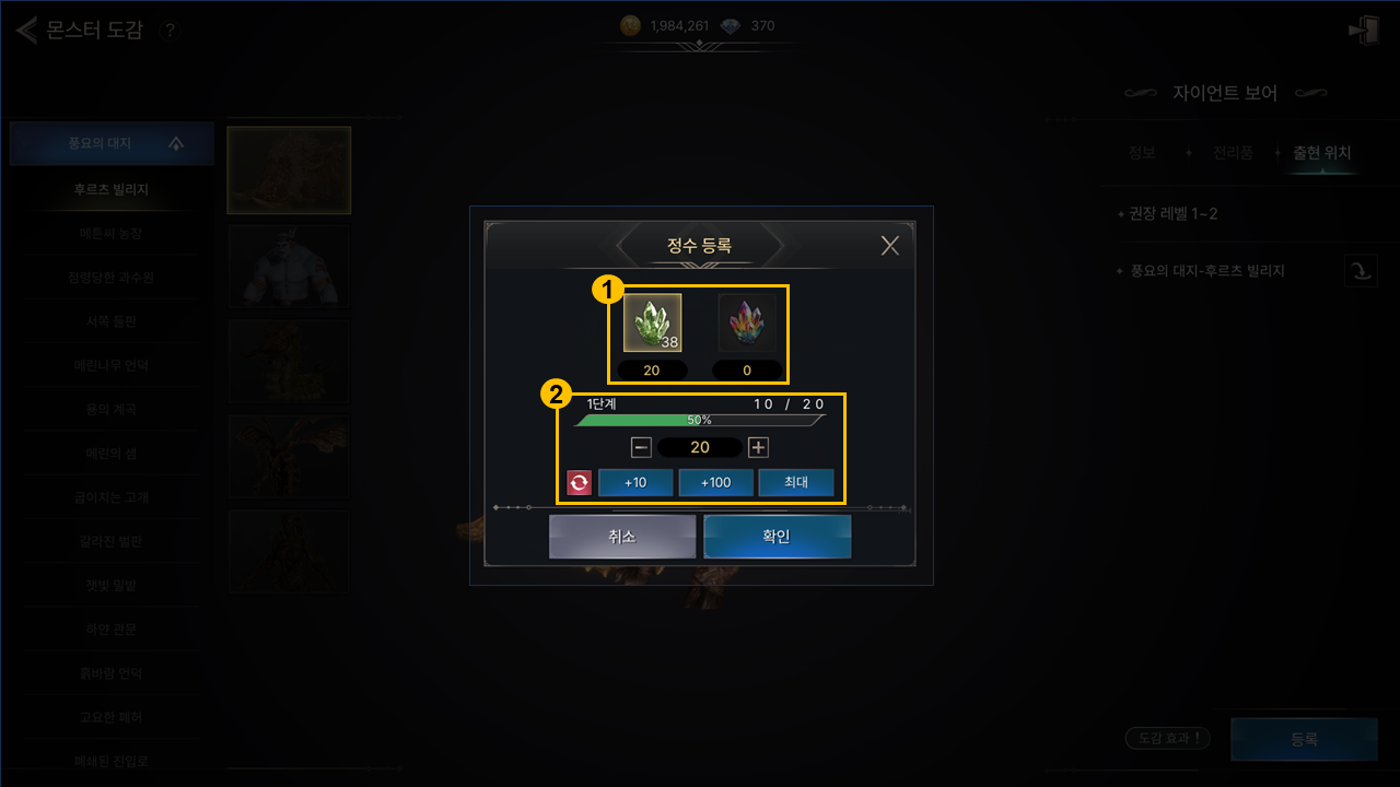 - - 정수 아이템을 등록해서 해당 몬스터의 도감 단계를 상승 시킬 수 있습니다.