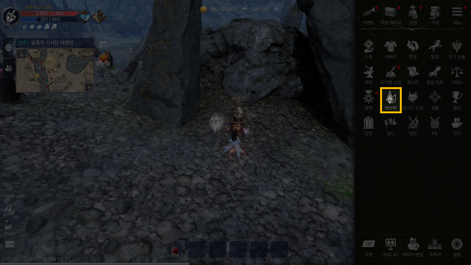 - [메뉴] – [아스터]를 눌러서 아스터 메뉴로 진입할 수 있습니다.