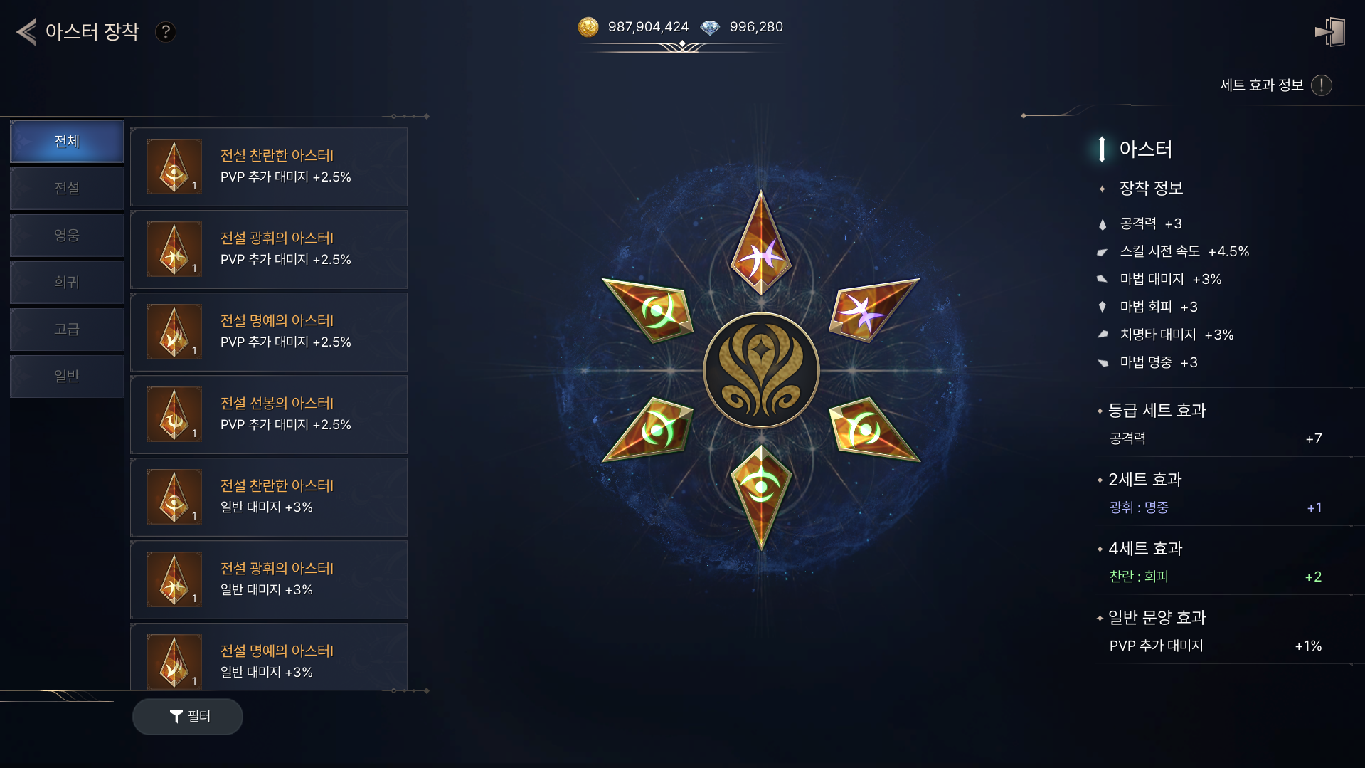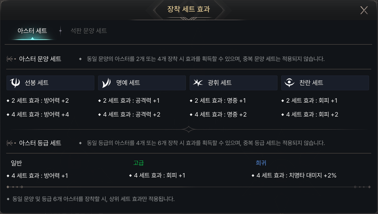 - 아스터 장착 시 종류, 개수, 등급에 따라 세트 효과가 적용됩니다.