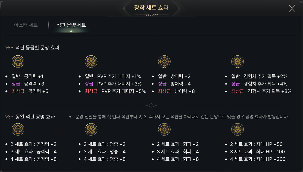 - 석판 문양 활성화 시 종류, 개수, 등급에 따라 세트 효과가 적용됩니다.