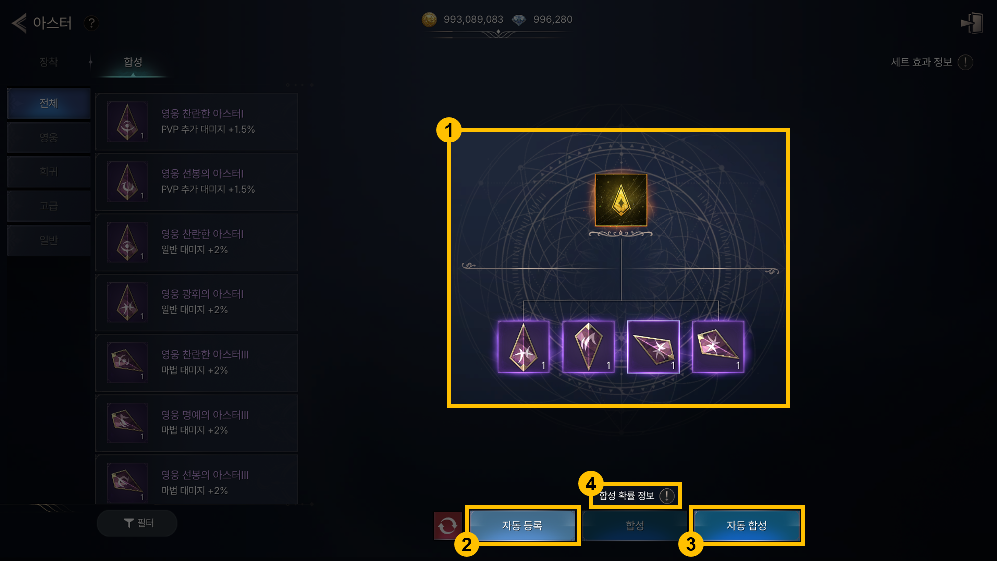 ※ 합성 확률 정보는 재료 아스터가 등록된 상태에서만 노출됩니다.