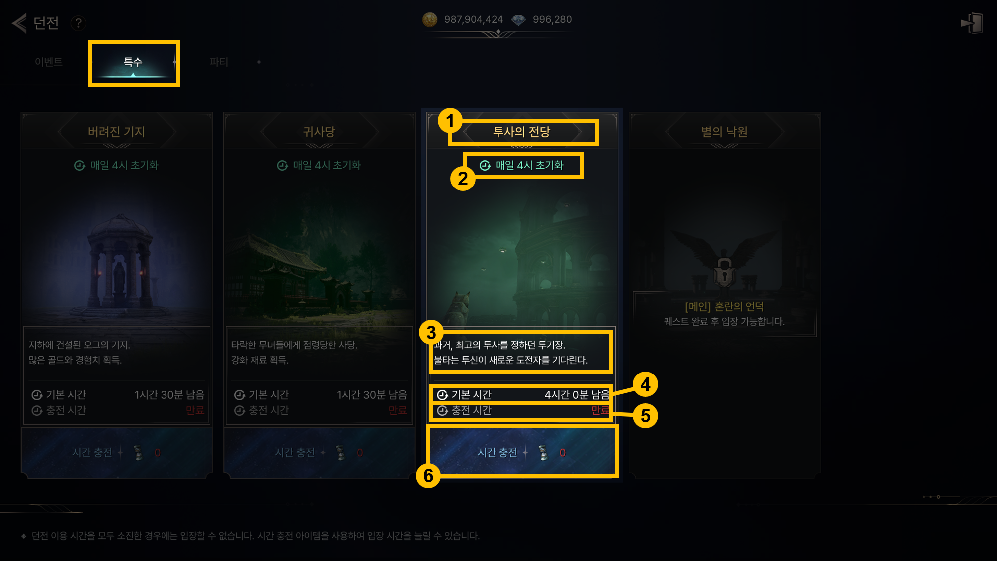 - - 기본 시간 모두 소진 시 초기화 전까지 입장할 수 없습니다.