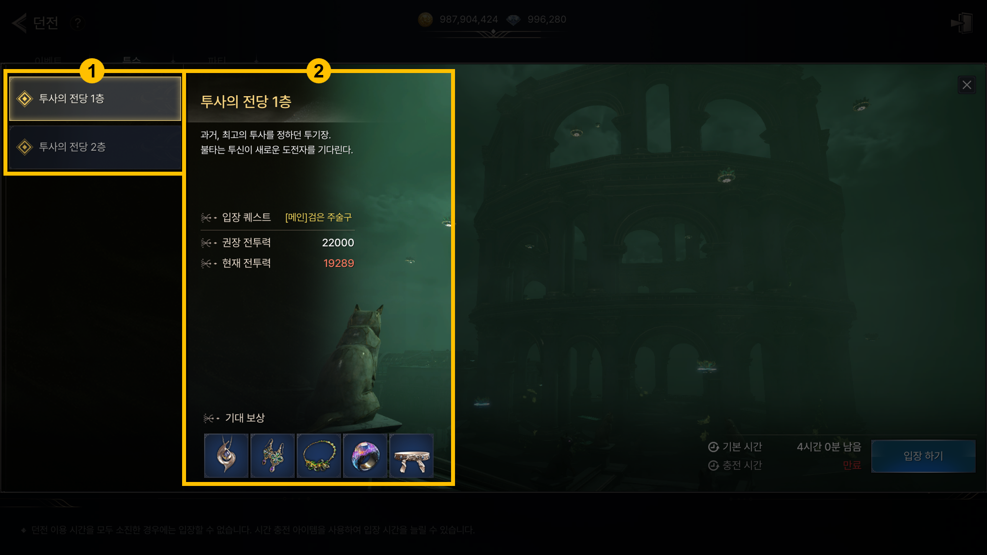 - 화면 우측 상단 [메뉴] – [던전]의 특수 던전 페이지에서 투사의 전당으로 진입할 수 있습니다.