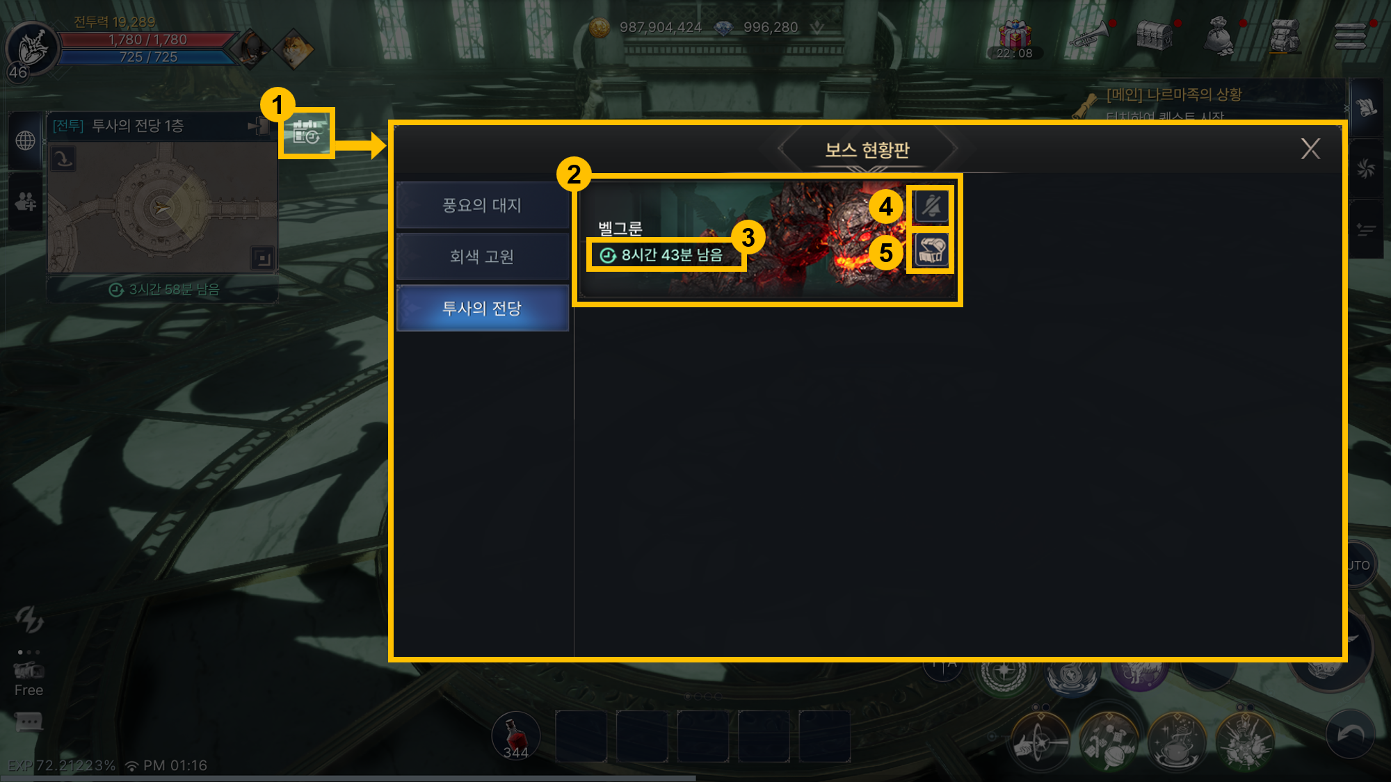 - - 보스 현황판 아이콘을 눌러 벨그룬 출현 정보를 확인할 수 있습니다.