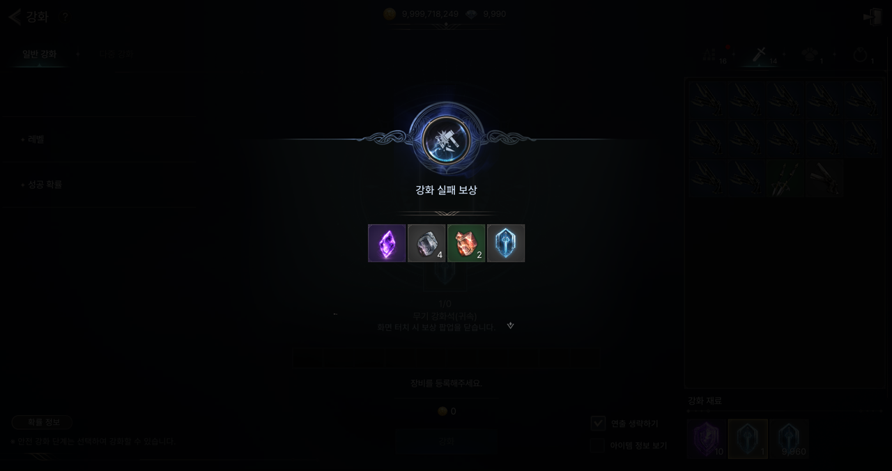 보호의 강화석(영웅) | 영웅 | +1 | 영웅 등급의 무기, 방어구, 장신구, 스페셜 장신구 강화에 사용할 수 있으며, 강화 실패 시 장비가 파괴되지 않습니다. |