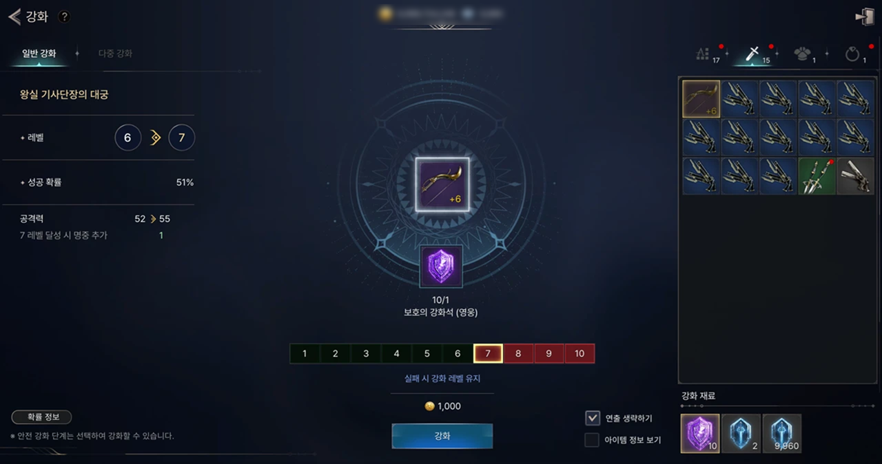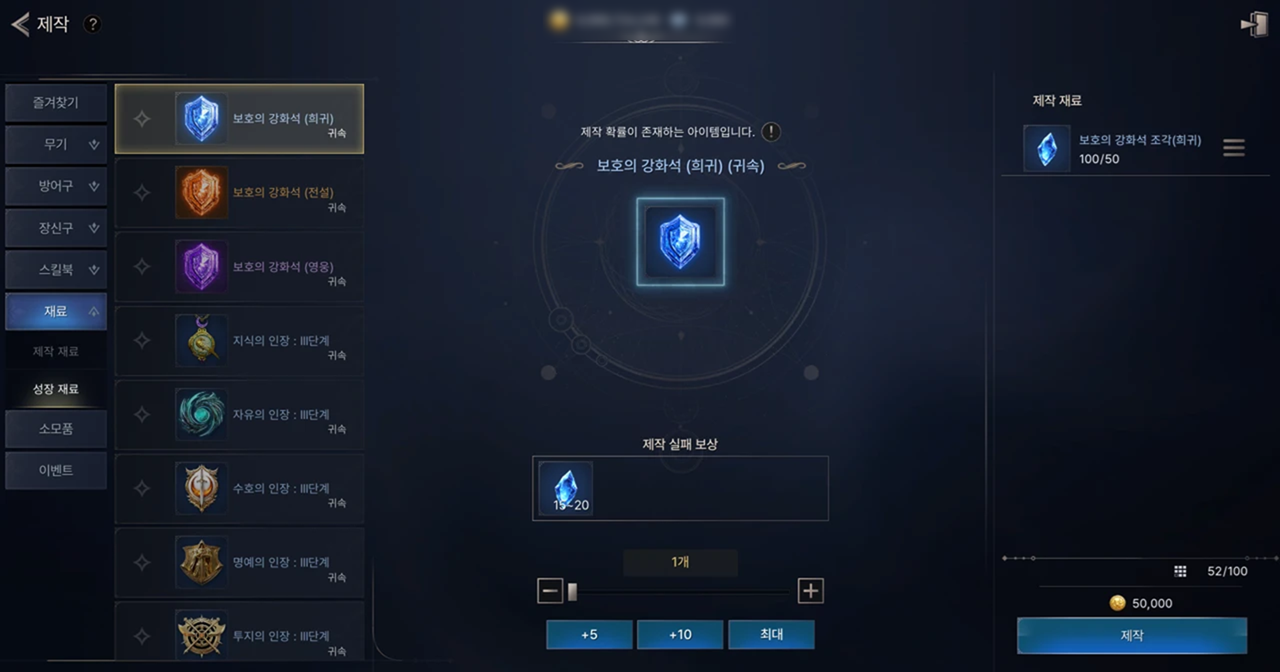 보호의 강화석(희귀) | 희귀 | +1 | 희귀 등급의 무기, 방어구, 장신구, 스페셜 장신구 강화에 사용할 수 있으며, 강화 실패 시 장비가 파괴되지 않습니다. |