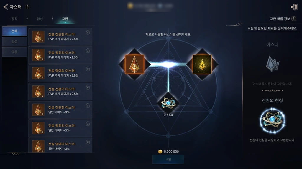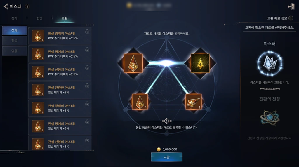 ● 신규 아이템 ‘전환의 천칭’을 재료로 사용하여 동일 등급의 아스터로 교환할 수 있습니다.