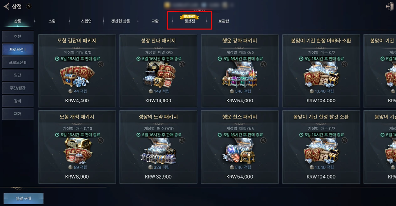 - 웹 상점에서 판매하는 재화 상품, 패키지 상품들은 마일리지 2배 이벤트가 적용됩니다.
