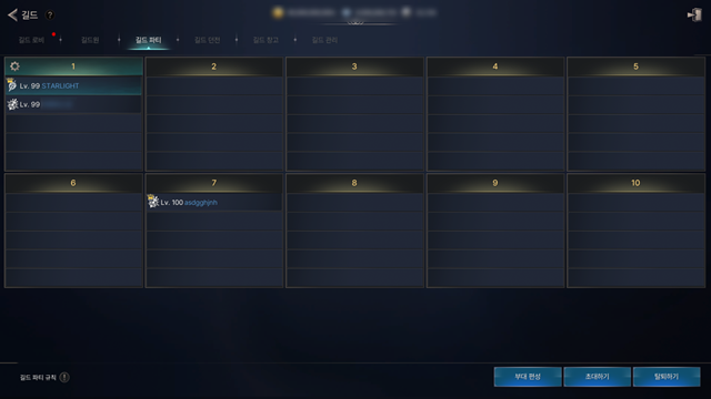 - 길드 파티는 총 10개의 부대별 파티로 구성되어 있습니다.