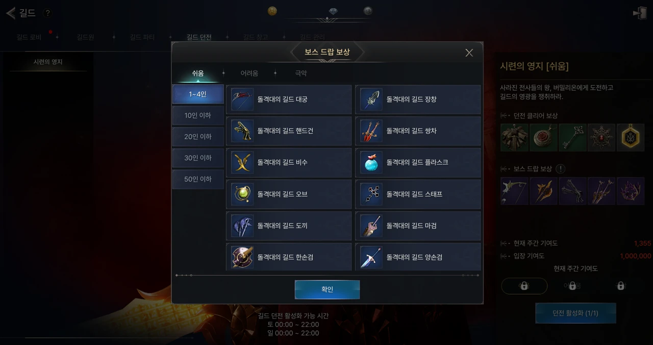 - 길드 던전 보스 드랍 보상이 참여 인원 수에 따라 지급되도록 변경될 예정입니다.