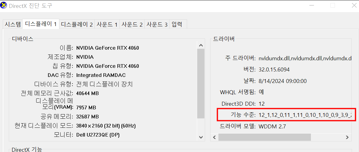 4) 우측 ‘드라이버’ 구역에 있는 ‘기능 수준’을 확인합니다.