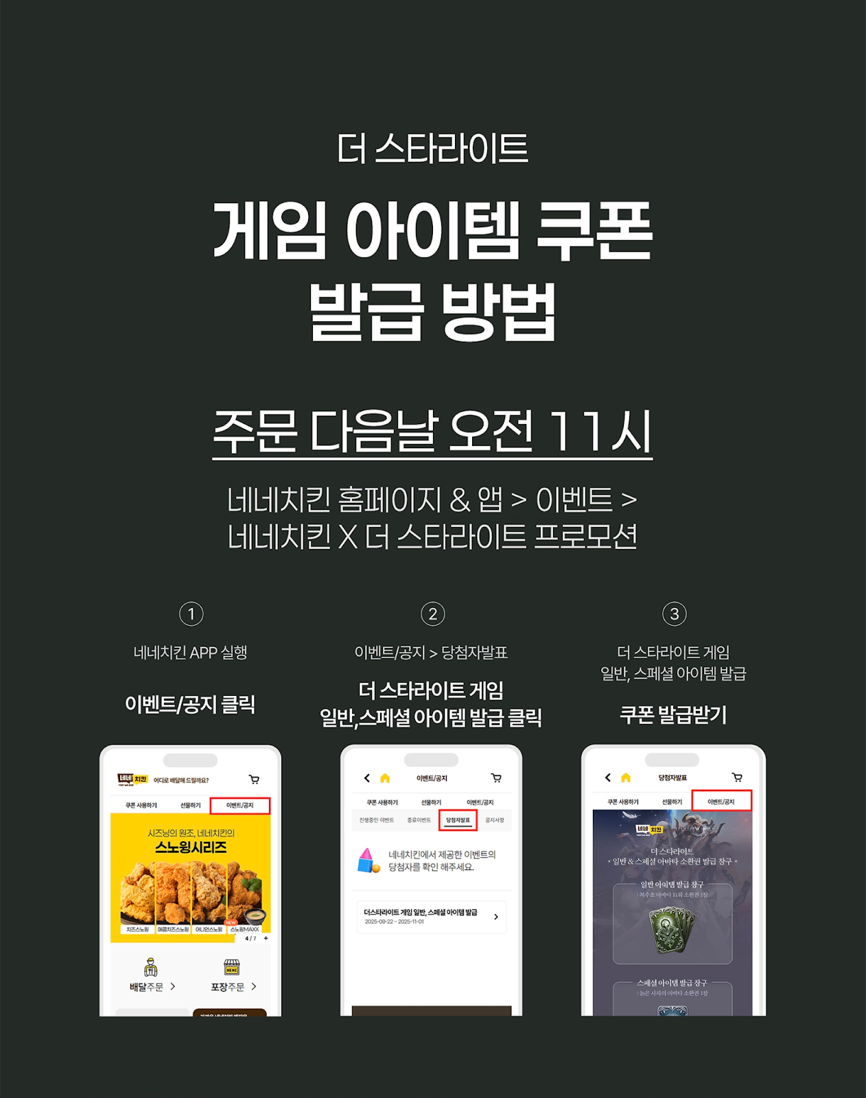 - 네네치킨 공식 홈페이지 또는 앱에서 치킨 구매시, 더 스타라이트 인게임 쿠폰을 받을 수 있습니다.