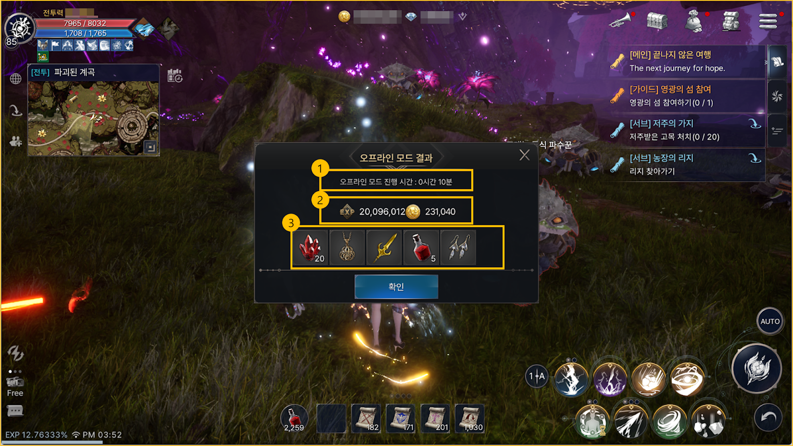 ● 오프라인 모드 진행 이후 게임 접속 시 오프라인 모드 결과를 확인할 수 있습니다.
