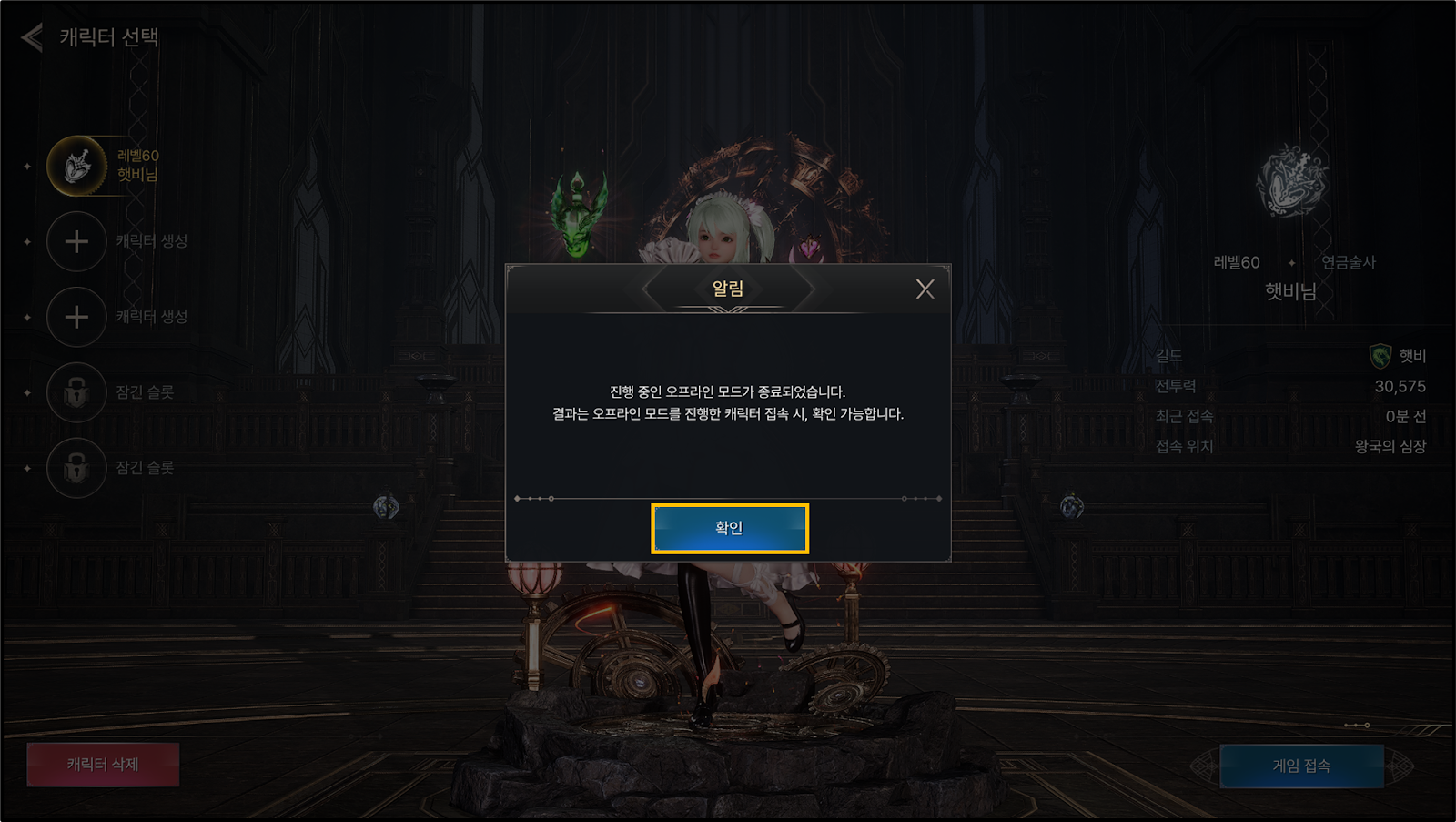 ● 오프라인 모드 진행 이후 캐릭터 선택 창 진입 시, 오프라인 모드를 종료합니다.