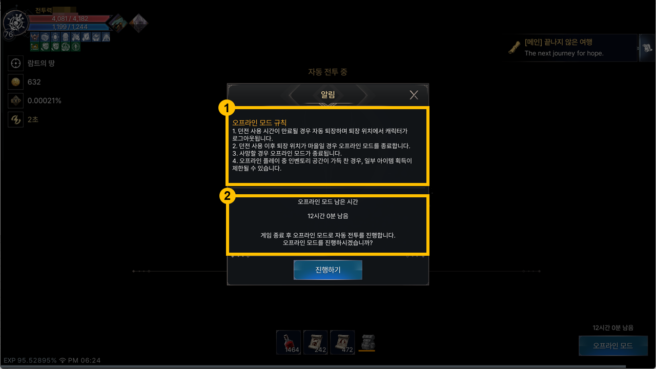 ● 자동 전투 중이 아닐 경우 오프라인 모드는 진행할 수 없습니다.