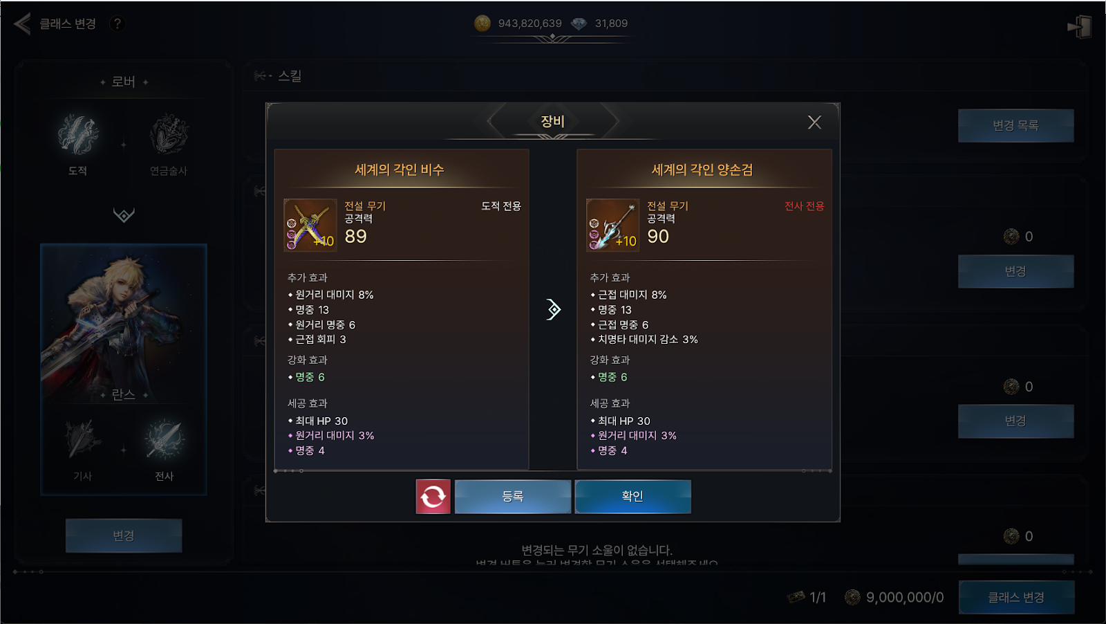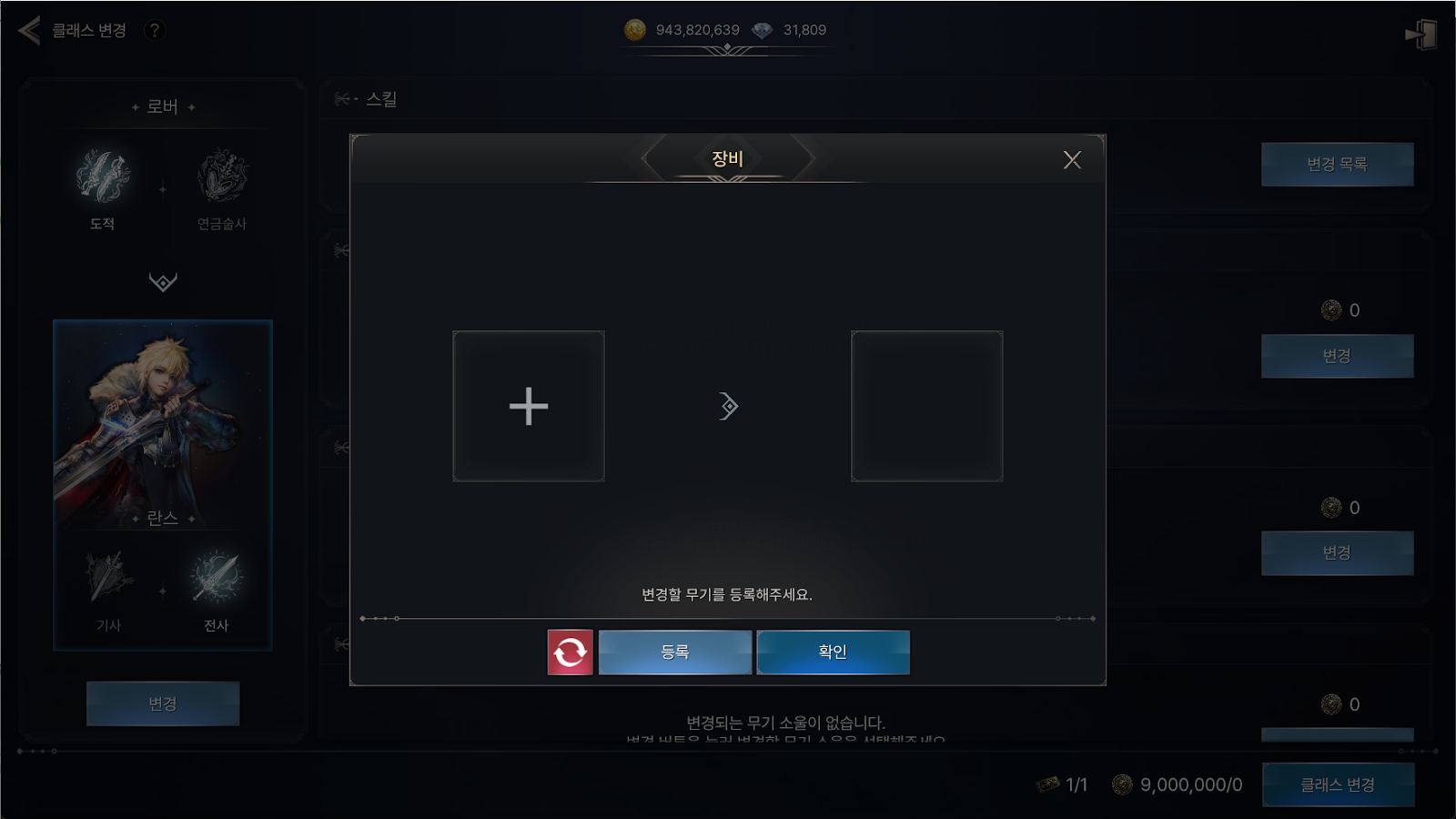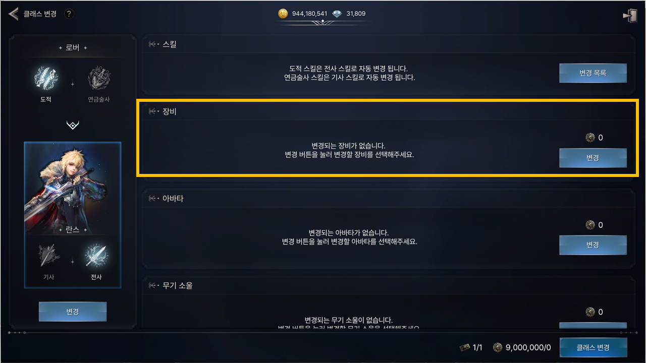 ※ 클래스 변경 후 장비 프리셋은 초기화됩니다.
