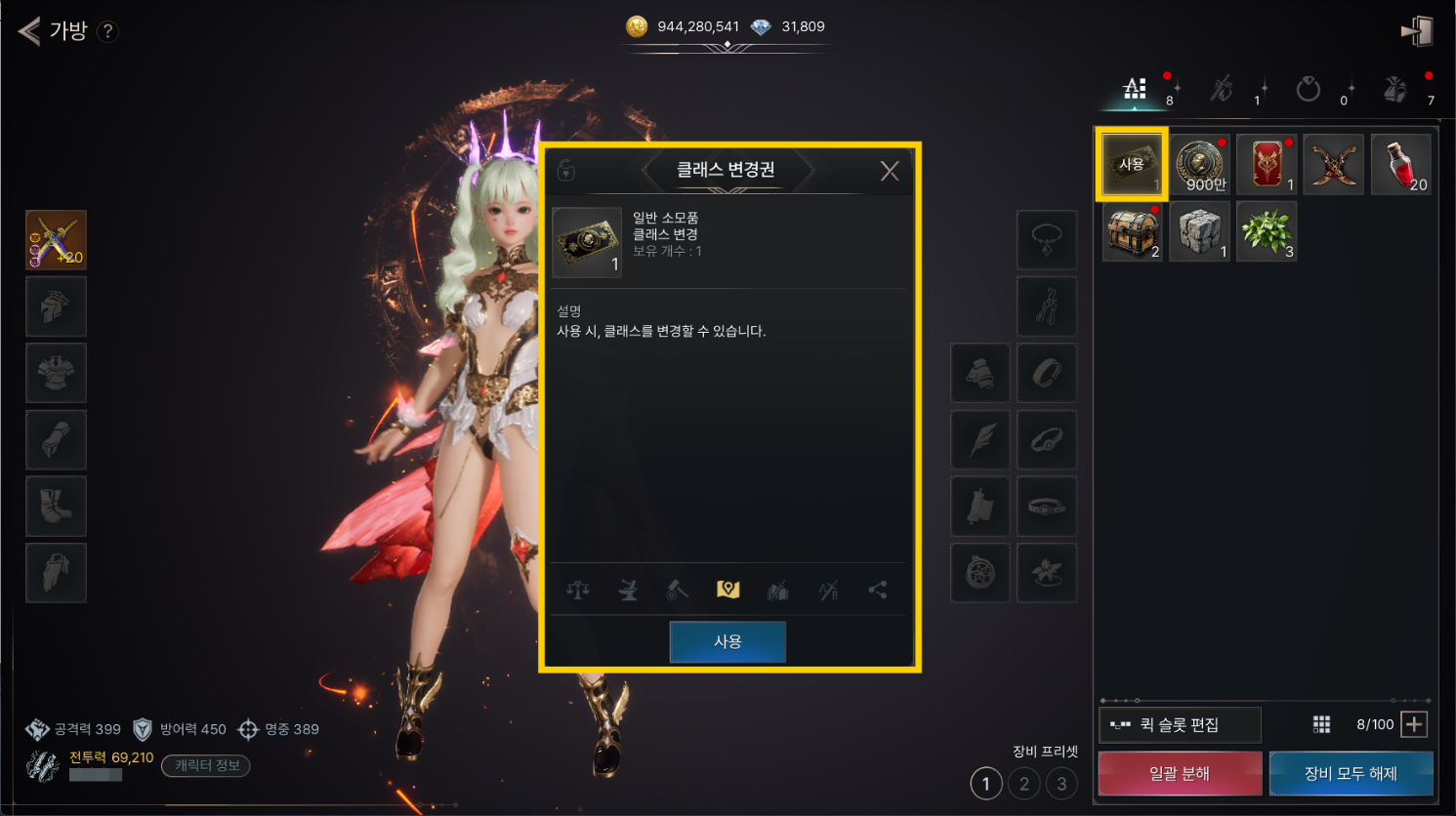 - 가방에서 클래스 변경권을 사용하여 클래스 변경 화면으로 진입할 수 있습니다.
