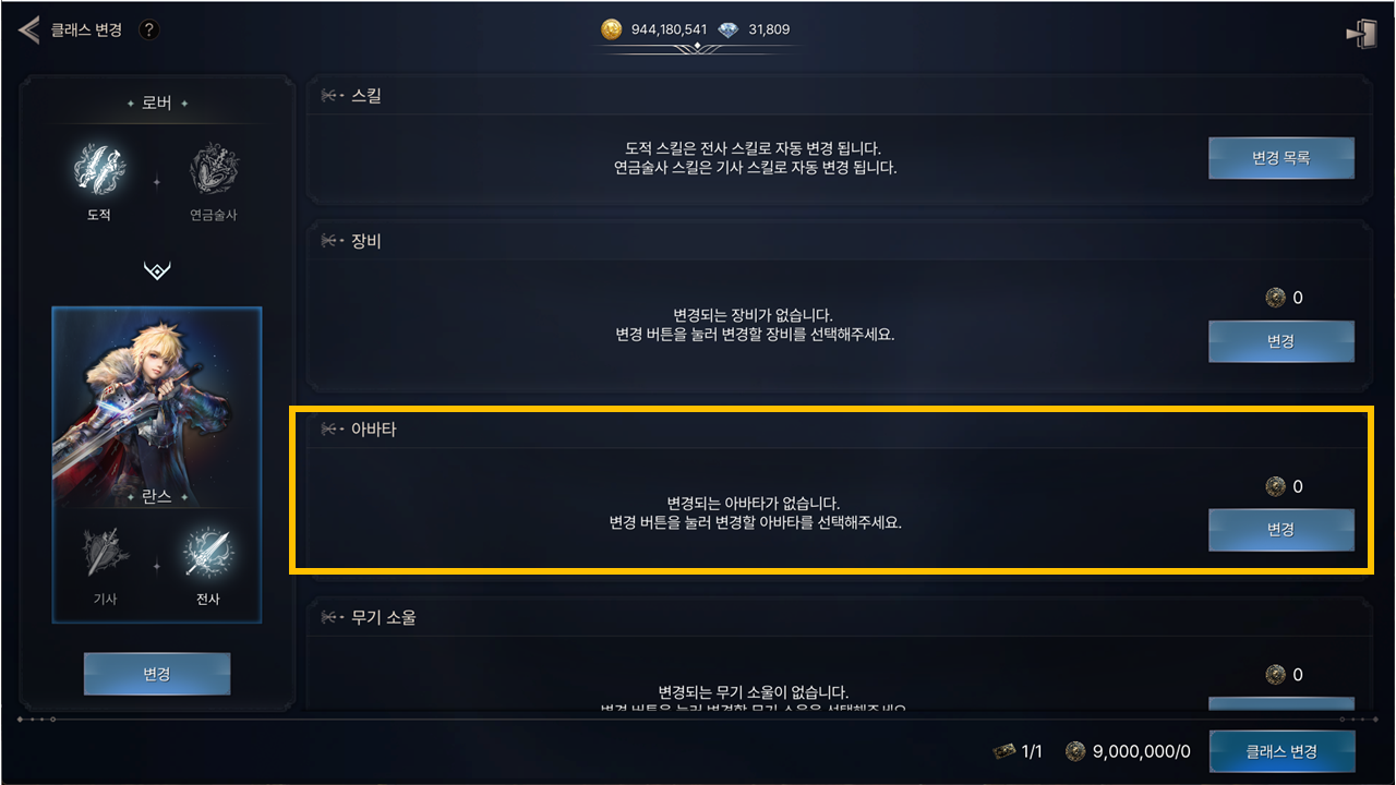 ※ 란스 클래스로 변경 시, 이벤트 희귀 아바타 2종은 변경할 수 없습니다.