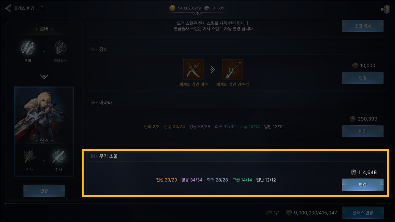 ※ 변경할 무기 소울 등급에 따라 필요한 클래스 변경 코인 개수가 상이합니다.