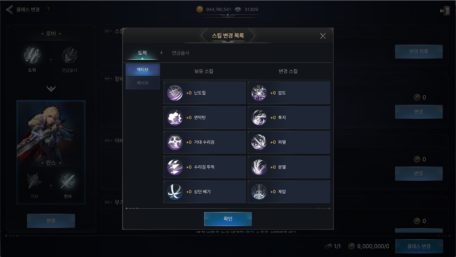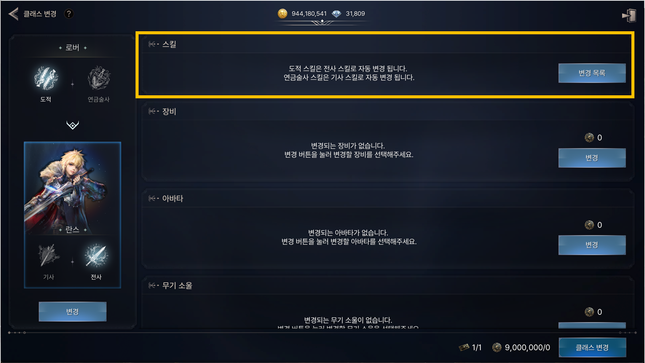 - 클래스 변경 시 변경되는 스킬의 강화 수치 및 강화 실패 보정 수치는 그대로 유지됩니다.